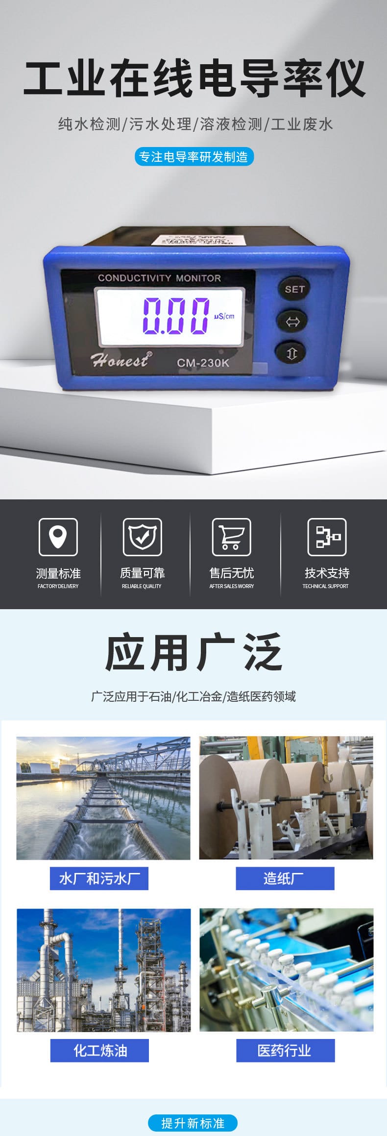 CM-230K型工业在线电导率仪是CM-230的升级产品,专为纯水、污水及工业溶液的电导率在线监测设计。产品采用单片机数字化技术,实现自动量程切换、自动零点调整和温度补偿(0~100℃),确保测量精准稳定。支持面板输入电极常数,配备3位LCD背光显示屏,电导率值直读显示。内置上限报警设置与继电器输出(3A/AC220V),可用于系统联动控制。标配1.00 cm⁻¹塑料铂金电极,支持管道螺纹或卫生级卡盘安装,适用于反渗透、海水淡化、化工、医药等多个行业。仪器尺寸为96×48×100mm(开孔91×45mm),电源为AC220V±10%,符合JB/T6855标准,由上海诚磁电子有限公司出厂质检保障,提供可靠的质量与售后服务。