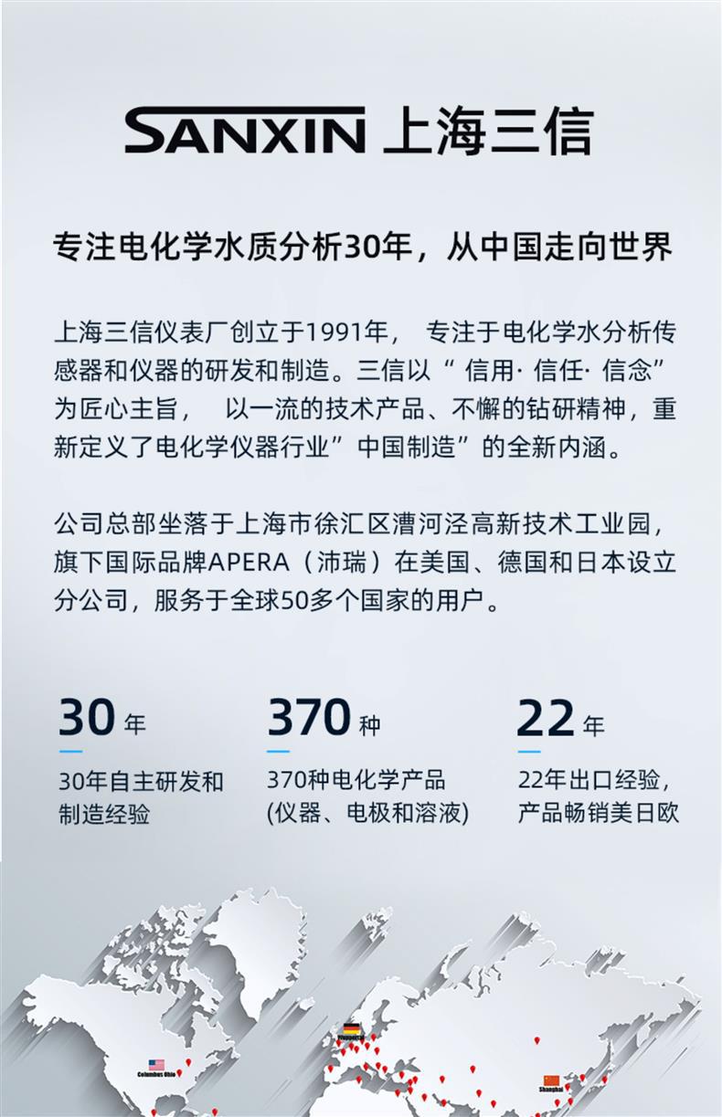 SANXIN SX650轻薄型专业电导率测试笔由上海三信沛瑞仪器科技有限公司(SANXIN APERA)研发生产,是一款集电导率、电阻率、TDS、盐度和温度测量于一体的便携式水质分析工具。产品采用智能芯片设计,支持1点自动校准和0~50℃自动温度补偿,确保测量精准可靠。机身尺寸仅为148×29×14mm,重量仅38g,便于随身携带,适合现场及野外使用。 SX650配备坚固的铂黑电极,电极直径为10mm,可在试管等小容量容器中直接测试,操作简便,仅需一个按键即可完成开关机、模式切换与校准。支持COND、RES、TDS、SAL四种测量模式循环切换,并具备IP57级防尘防水性能,适应多种复杂环境。 技术参数: - 电导率测量范围:0~50.0μS/cm 至 5.0~50.0mS/cm - 电阻率:0~20.0MΩ·cm - TDS:0~35.0g/L - 盐度:0~25.0ppt - 温度范围:0~50.0℃ - 精度:电导率±1.0%FS,温度±0.5℃ - 电源:CR2032锂电池×2,连续使用超100小时 应用领域包括教育科研、环境监测、饮品质量控制、水处理、水产养殖、水培、游泳池与温泉管理等。每台仪器出厂前均已校准,附带1413μS/cm校准液、浸泡液、说明书及专用口袋手提盒,开箱即用。 本产品享受2年质保服务,支持7天无理由退换货,提供13%增值税专用发票。三信专注电化学水质分析30年,产品远销欧美日等50多个国家,品质值得信赖。