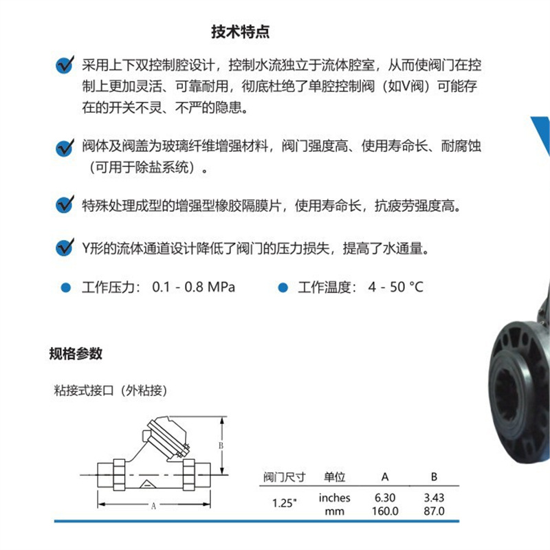本系列隔膜阀采用上下双控制腔设计,控制水流独立于流体腔室,确保开关灵活、运行可靠,彻底避免传统单腔阀的卡顿与泄漏问题。阀体与阀盖采用玻璃纤维增强材料制造,强度高、耐腐蚀,适用于除盐系统等严苛工况。特殊成型的增强橡胶隔膜片具有优异的抗疲劳性能,大幅延长使用寿命。Y型流道设计有效降低压力损失,提升介质通量。 产品涵盖多种功能类型:常开(201)、常闭(202)、限位调节(203)、辅助关闭(204)、信号反馈(209)、液位自动控制(210)及电磁控制(207/208)等,满足自动化系统需求。接口形式包括粘接式(外/内)、活接式及法兰式(德标/美标),适配DN15至DN300多种规格,兼容国标、美标、日标等国际管材标准。 广泛应用于水处理、石油化工、冶金、制药、食品生产及机械等行业。安装方式支持UPVC/CPVC胶黏连接及PPH热熔焊接,确保密封性与系统稳定性。工作压力0.1–0.8 MPa,温度范围4–50℃,安全实用,品质可靠。