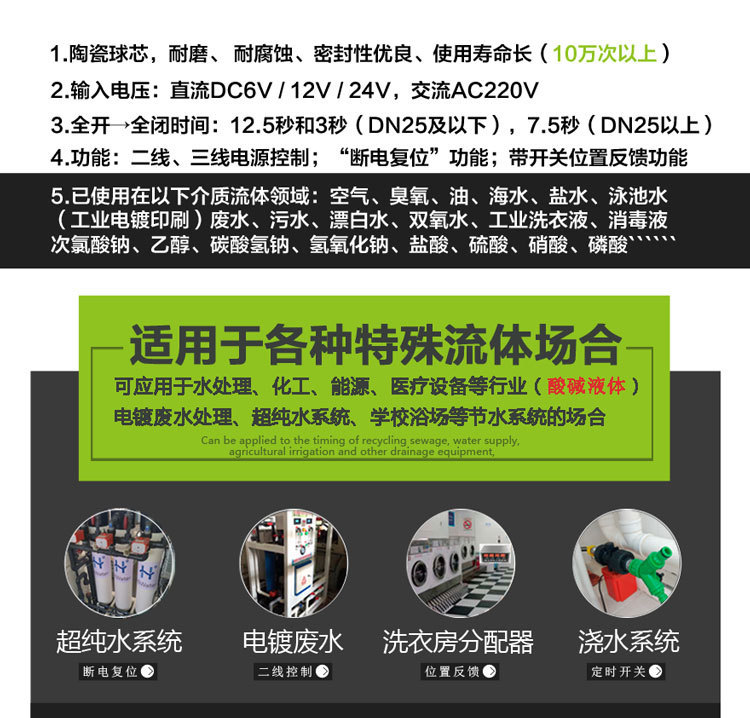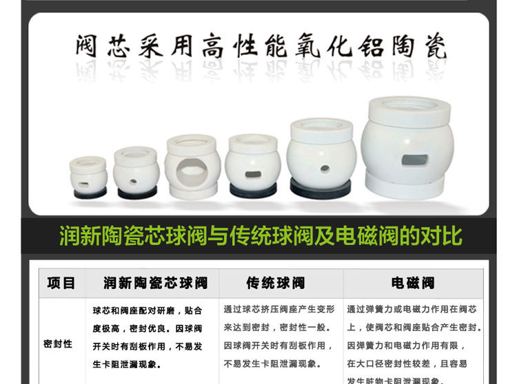 润新(RUNXIN)陶瓷芯电动球阀采用高性能氧化铝陶瓷阀芯(HRA≥85°),具有优异的耐磨性、耐腐蚀性和长久密封寿命(超过10万次)。阀体材质可选PPO或PPH,耐酸碱性强,适用于水、空气、油类、酸碱腐蚀性介质及化工低粘度流体。产品提供多种控制模式:二线正负反接、断电复位、三线控制、交流AC220V及五线带位置反馈,满足不同自动化需求。启闭时间短(3-12.5秒),工作压力0-1.0MPa,防护等级IP65,适用温度0-60°C。广泛应用于水处理、电镀废水、超纯水系统、泳池水处理、工业清洗、医疗设备及农业灌溉等领域。支持内螺纹、UPVC胶粘、PPR热熔等多种连接方式,配置316L不锈钢阀杆(可选哈氏合金),确保长期稳定运行。