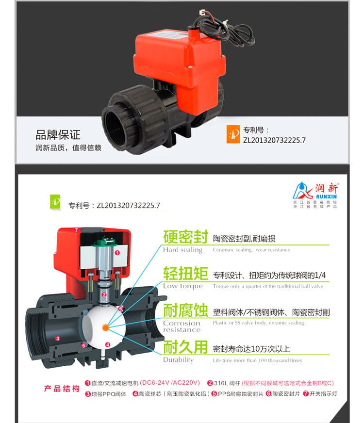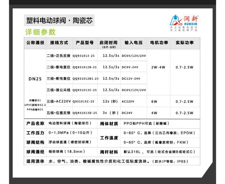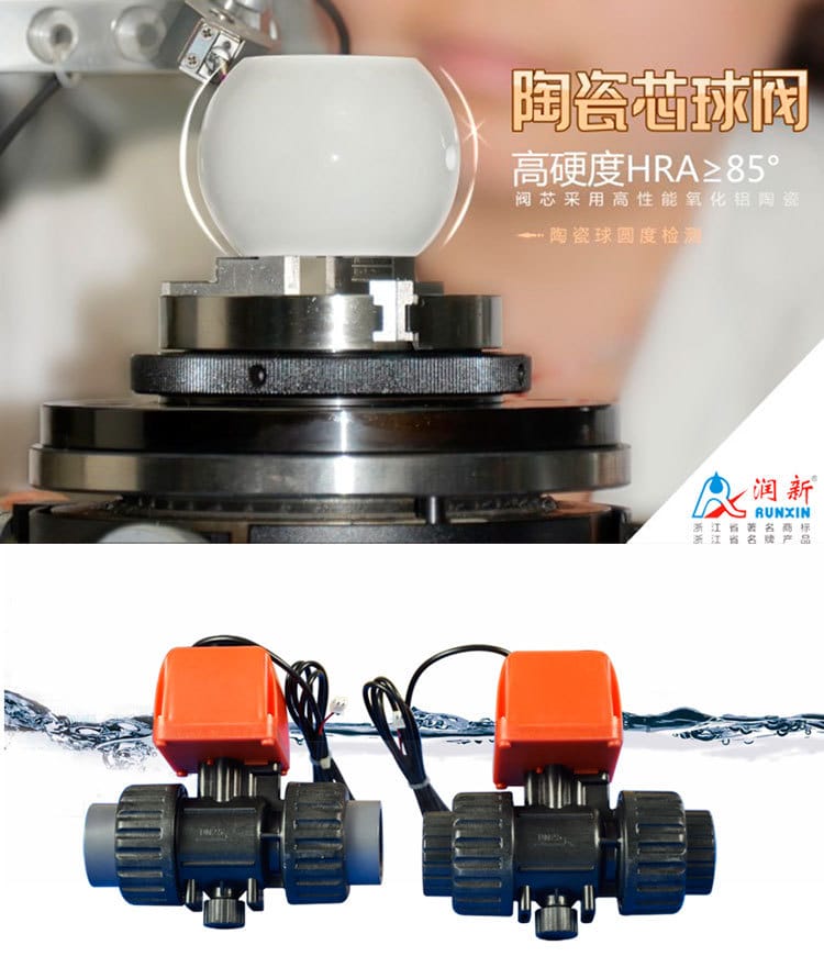 润新(RUNXIN)陶瓷芯电动球阀采用高性能氧化铝陶瓷阀芯(HRA≥85°),具有极高的耐磨性、耐腐蚀性和优异的密封性能,使用寿命可达10万次以上。阀体材质可选PPO或PPH,耐酸碱性强,适用于水、空气、油类、海水、盐水、废水、双氧水、次氯酸钠、盐酸、硫酸等多种腐蚀性介质。 产品支持多种控制模式:普通二线、断电复位二线/三线、三线公共线、AC220V三线及五线位置反馈控制。输入电压涵盖DC6V/12V/24V和AC220V,启闭时间短(最快3秒),配备316L不锈钢阀杆(可选哈氏合金),确保长期稳定运行。 广泛应用于水处理、超纯水系统、电镀废水处理、化工、能源、医疗设备、农业灌溉、节水系统等领域。具备IP65防护等级,支持内螺纹、UPVC胶粘、PPR热熔等多种连接方式,安装灵活,性能可靠,是替代传统球阀和电磁阀的理想选择。