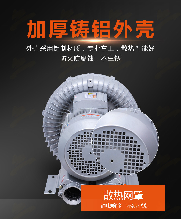 全风环保科技股份有限公司专业生产RB系列高压鼓风机,产品具备吹吸两用功能,风力强劲,运行稳定。采用航空铝材高压螺旋风叶,加宽加厚叶片设计,出风更均匀,吸力更猛劲。离心循环结构结合精细车工工艺,确保性能持久稳定。 风机配备加厚铸铝机壳,防火、耐腐蚀、不生锈,散热性能优异;搭配静电喷涂散热网罩,色泽均匀,不易掉漆。核心部件采用纯铜线圈,动力强劲,功率足,使用寿命长。 高效进出风口均配置过滤网,有效阻挡灰尘与杂质,保持内部清洁。精密接线盒设计紧凑,连接可靠,提升整体安全性与耐用性。 产品广泛应用于河塘投饵、负压吸料、热风送风、压铸机冷却等工业场景,支持非标定制,现货供应,售后服务完善,是您可靠的工业气源解决方案选择。