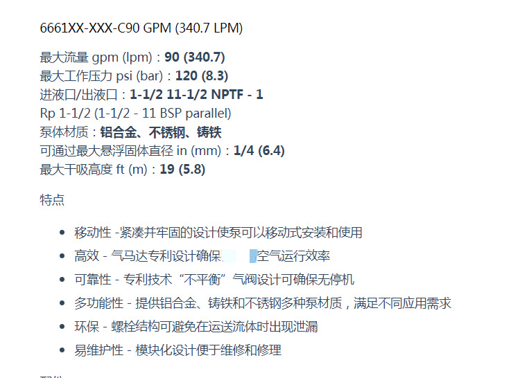 隆胜机械提供高性价比、节能环保的英格索兰(Ingersoll Rand)ARO系列气动隔膜泵,型号6661XX-XXX-C,最大流量达90 GPM(340.7 LPM),最大工作压力120 psi(8.3 bar),广泛应用于工业流体输送。泵体材质可选铝合金、不锈钢或铸铁,过流部件材料灵活配置,适应不同介质需求。 产品特点: - 移动性强:紧凑牢固设计,便于移动安装使用; - 高效运行:专利气马达设计提升空气利用效率; - 高可靠性:独特的‘不平衡’气阀技术,避免停机故障; - 多功能性:支持多种泵体与膜片材质组合,满足腐蚀性、高固含量等复杂工况; - 环保密封:螺栓式结构防止泄漏,符合环保要求; - 易于维护:模块化设计,拆装维修便捷。 膜片可选材质包括氟橡胶、丁腈橡胶、氯丁橡胶、三元乙丙橡胶、聚四氟乙烯/山道橡胶复合膜及杜邦聚酯弹性体,适配酸碱、溶剂、污泥等多种介质。进液口/出液口为1-1/2" NPTF或BSP平行螺纹,最大可通过悬浮固体直径为1/4英寸(6.4mm),干吸高度可达19英尺(5.8米)。 本产品享受一年质保,售后无忧,厂家直销,支持加工定制,货源充足,快速发货,是工业领域理想的选择。