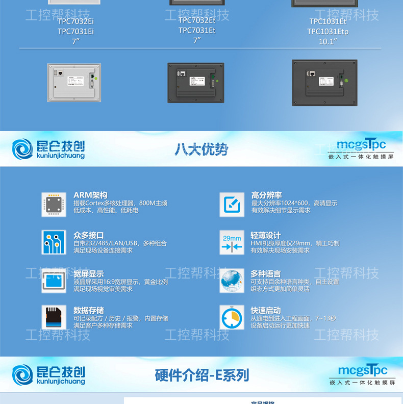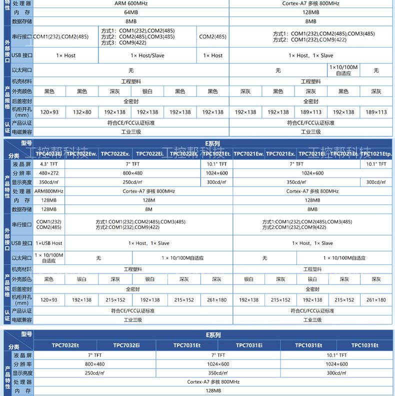 昆仑通态E系列触摸屏是基于Linux系统的高性能嵌入式一体化HMI设备,由昆仑技创研发推出。该系列搭载ARM架构处理器(主频最高达800MHz),配备4.3英寸至10.1英寸TFT真彩宽屏,分辨率支持480×272至1024×600,提供清晰的视觉体验。产品标配RS232、RS485、USB及LAN接口,满足多种工业通信需求。整机采用工程塑料结构,支持嵌入式安装,前面板达到IP65防护等级,可在0℃~45℃环境下稳定运行,适用于制造业、能源、水处理等自动化控制领域。E系列产品具有低功耗、高稳定性、快速启动(7~13秒)和大容量数据存储等特点,配合McgsPro组态软件,实现灵活便捷的人机交互设计。
