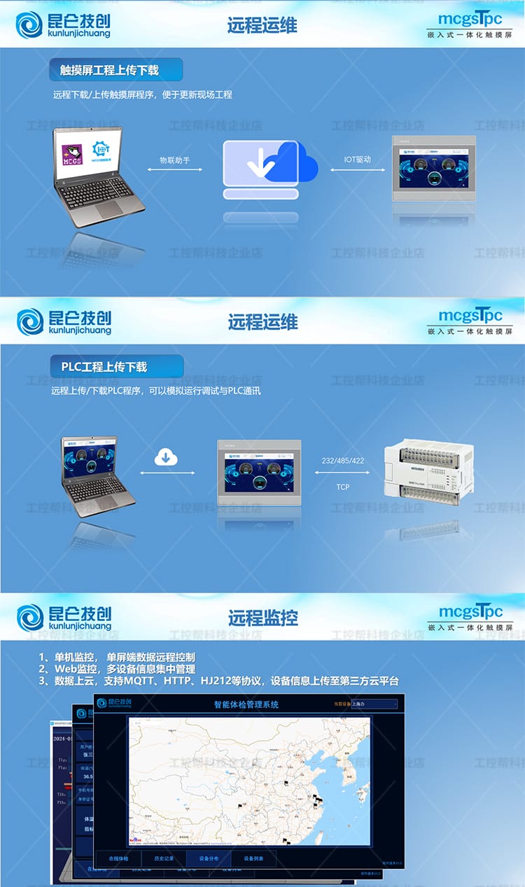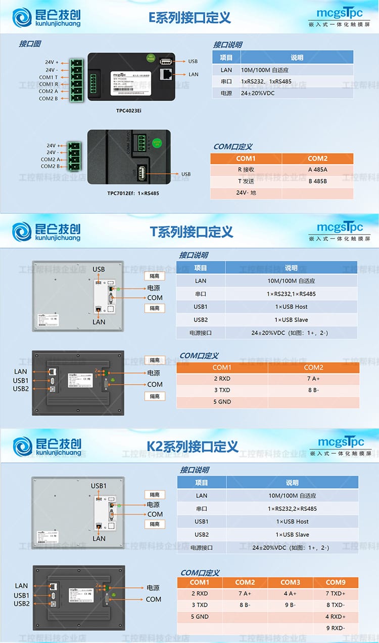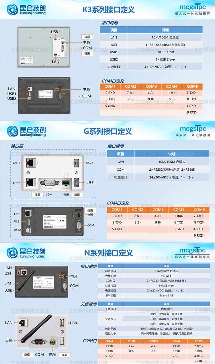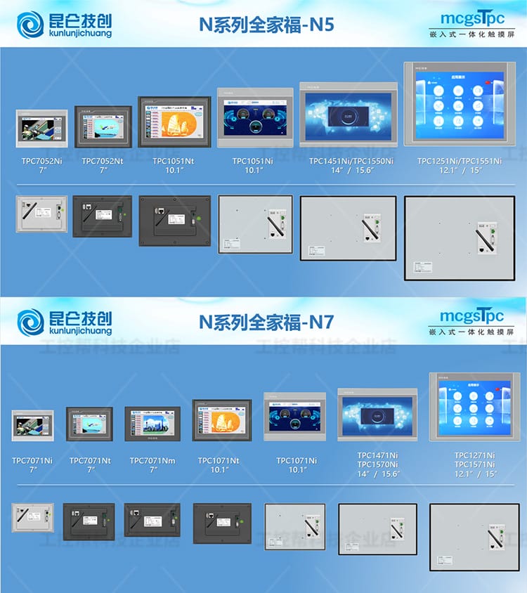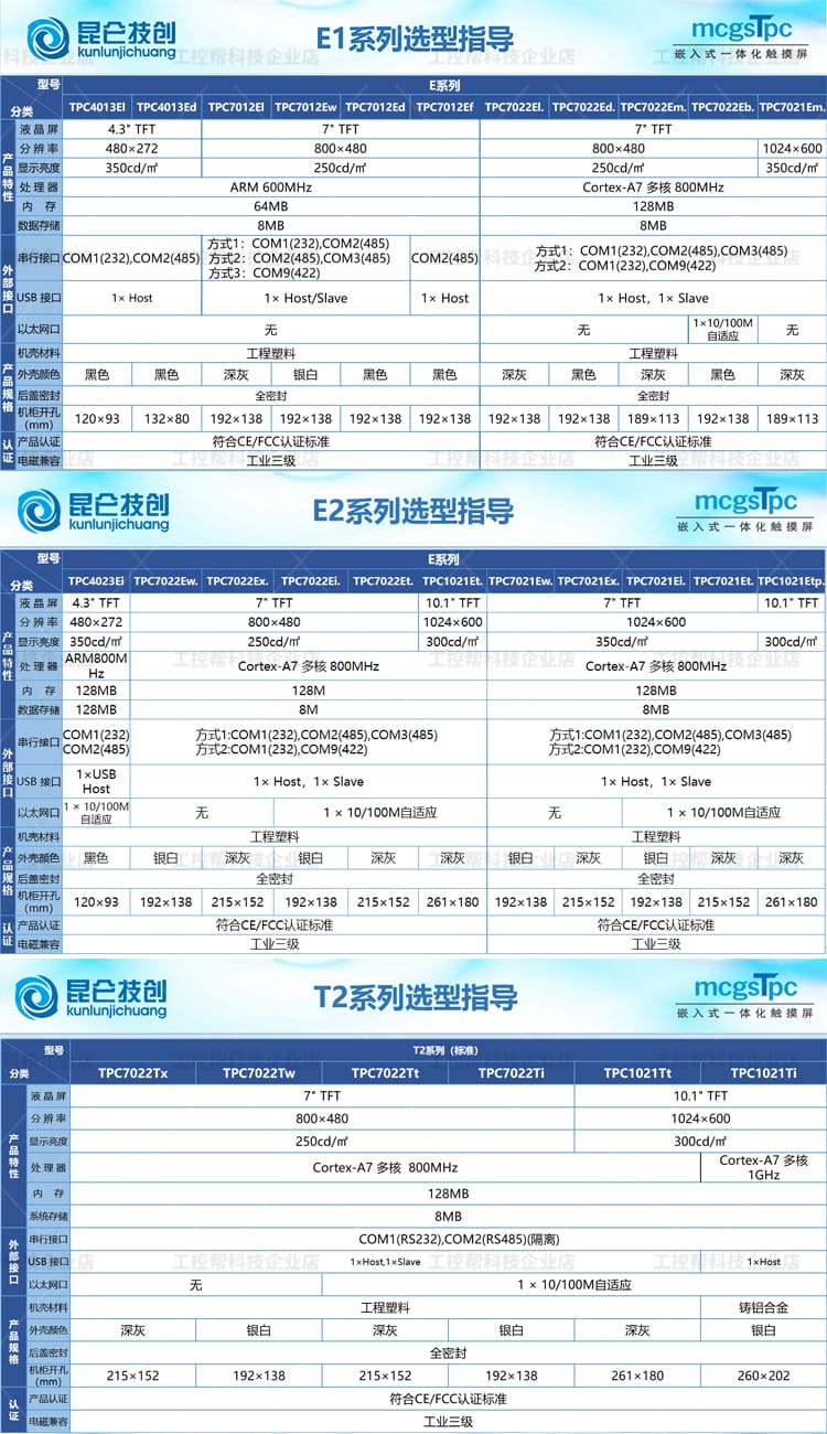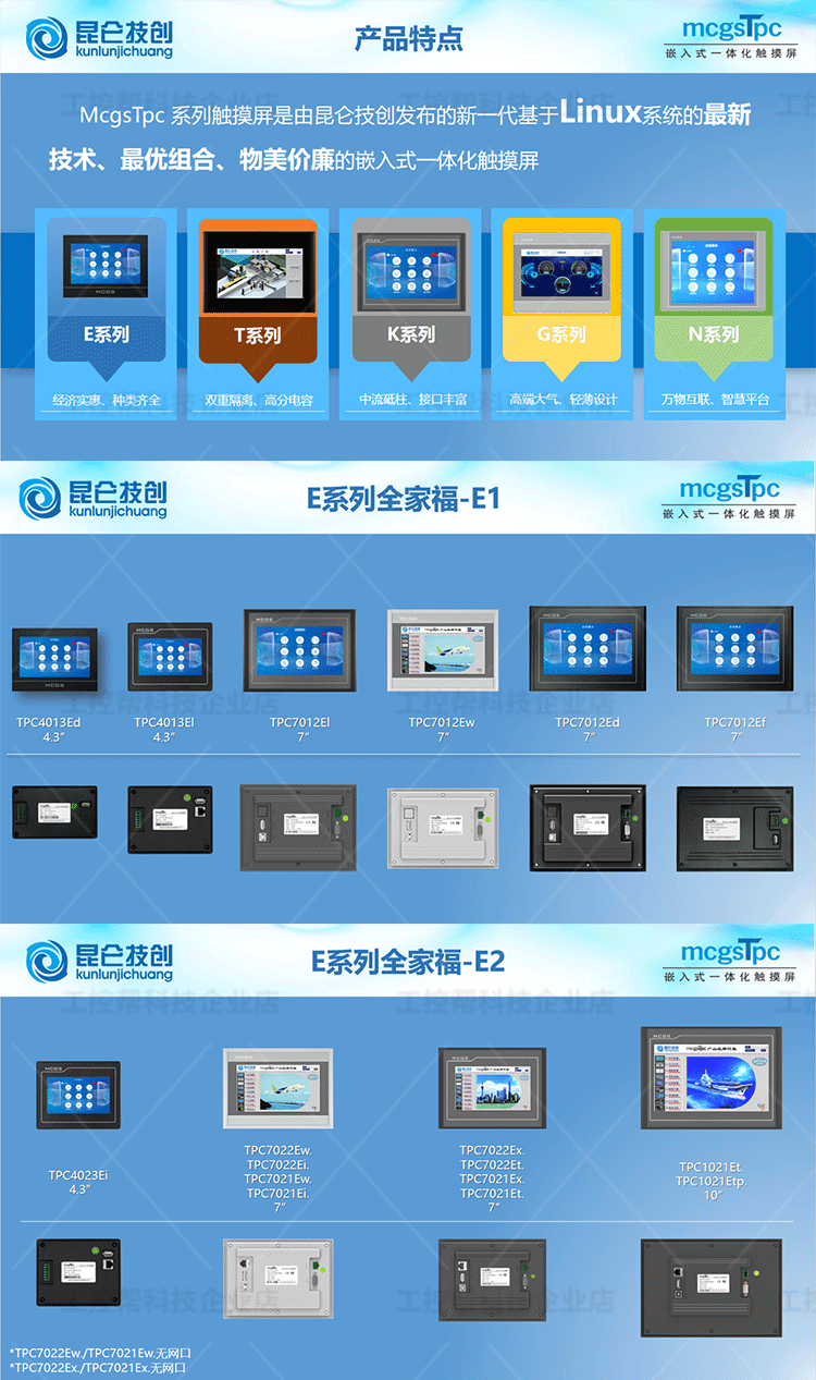 昆仑技创(kunlunjichuang)推出的MCGS TPC系列触摸屏是新一代基于Linux系统的嵌入式一体化人机界面设备,广泛应用于工业自动化控制领域。产品涵盖E系列、T系列、K系列、G系列和N系列,具备经济实惠、接口丰富、高分辨率、工业级防护等特点。 各系列产品覆盖4.3英寸至15.6英寸多种屏幕尺寸,采用TFT液晶显示技术,支持电容触摸,具备良好的显示亮度与稳定性。核心配置包括ARM处理器或Cortex-A7多核平台,配备64MB/128MB内存及8MB存储空间,满足不同层级应用需求。 接口方面,提供串行通信(RS232/RS485)、USB Host/Slave、部分型号支持10/100M以太网口,满足多样化设备连接需求。外壳采用工程塑料材质,具备全密封设计,通过CE/FCC认证,符合工业三级电磁兼容标准,确保在复杂工业环境中稳定运行。 该系列广泛适用于PLC控制系统、智能制造、自动化产线等人机交互场景,是性价比高、性能可靠的工控触摸屏解决方案。
