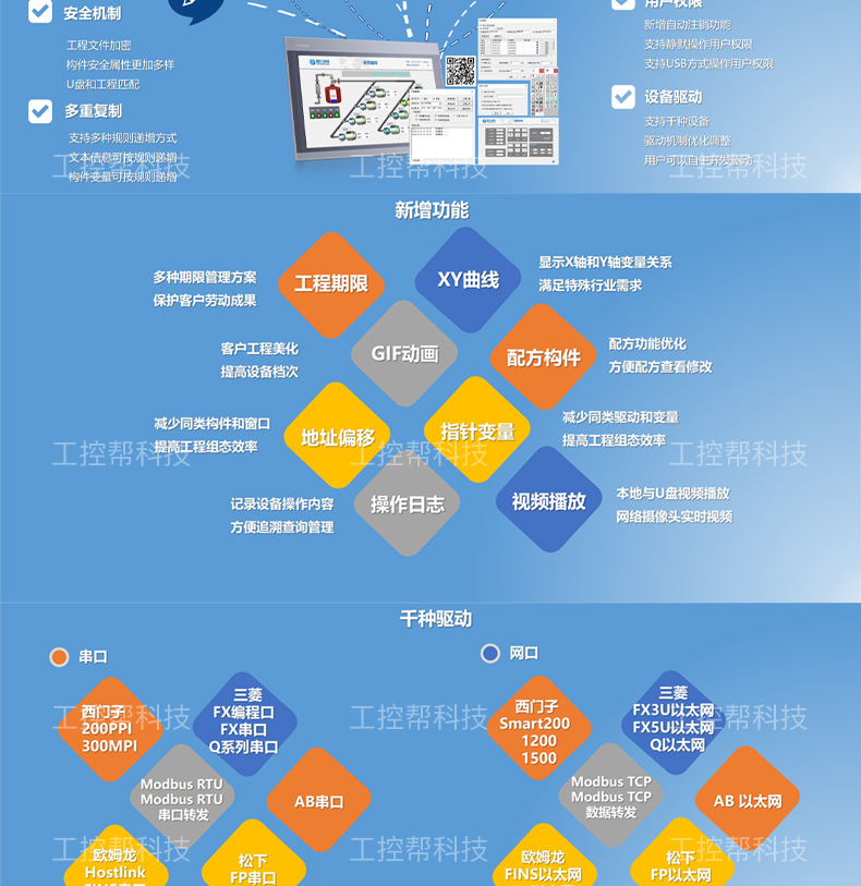 昆仑通态G系列物联网触摸屏由昆仑技创推出,是一款高性能嵌入式一体化HMI设备。产品采用Cortex四核处理器,主频高达1GHz,基于ARM架构实现低功耗、高效率运行,适用于工业自动化控制场景。支持7寸、10.1寸、12.1寸、15.6寸等多种尺寸,最高分辨率达1920×1080(FHD),提供清晰细腻的视觉体验。全系列标配双RS485串口、RS232、LAN及USB接口,支持多种设备连接。前面板达到IP65防护等级,采用密封外壳设计,防尘防潮,适应复杂工业环境。支持McgsPro组态软件,兼容Linux操作系统,提供开放平台支持数据库、VNC、打印机、摄像头等外设扩展。支持嵌入式安装与支架安装,多种开孔尺寸满足不同现场需求,是工业人机交互的理想选择。