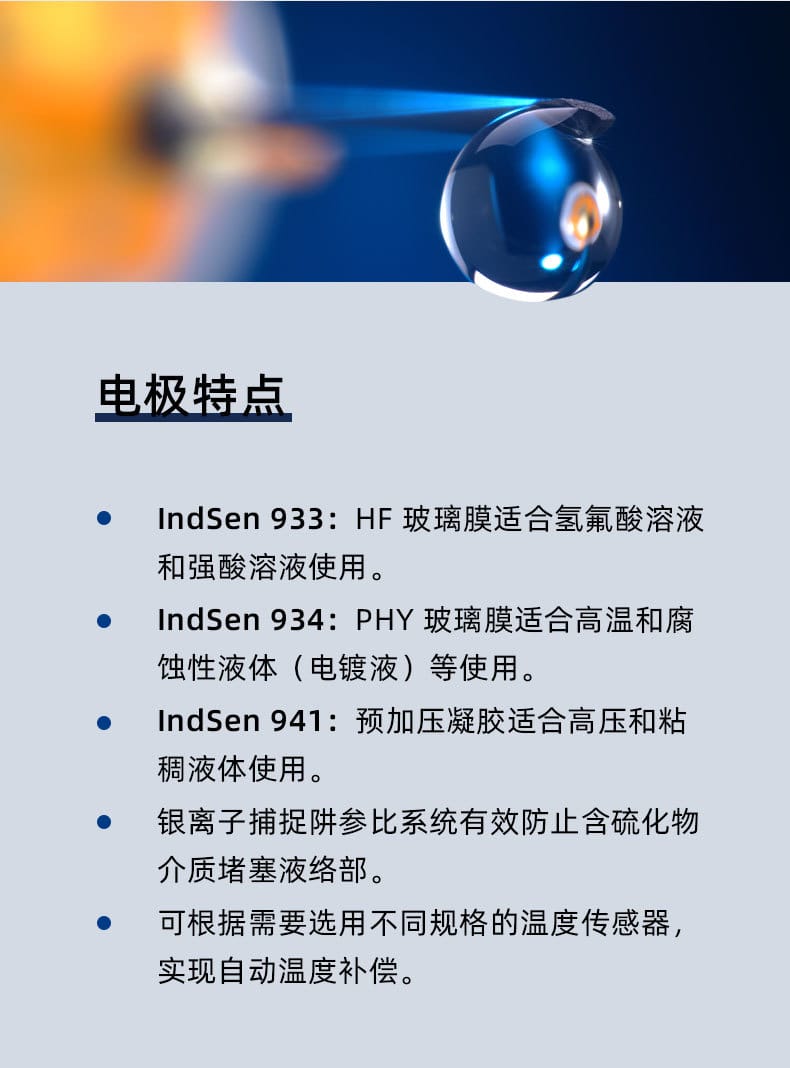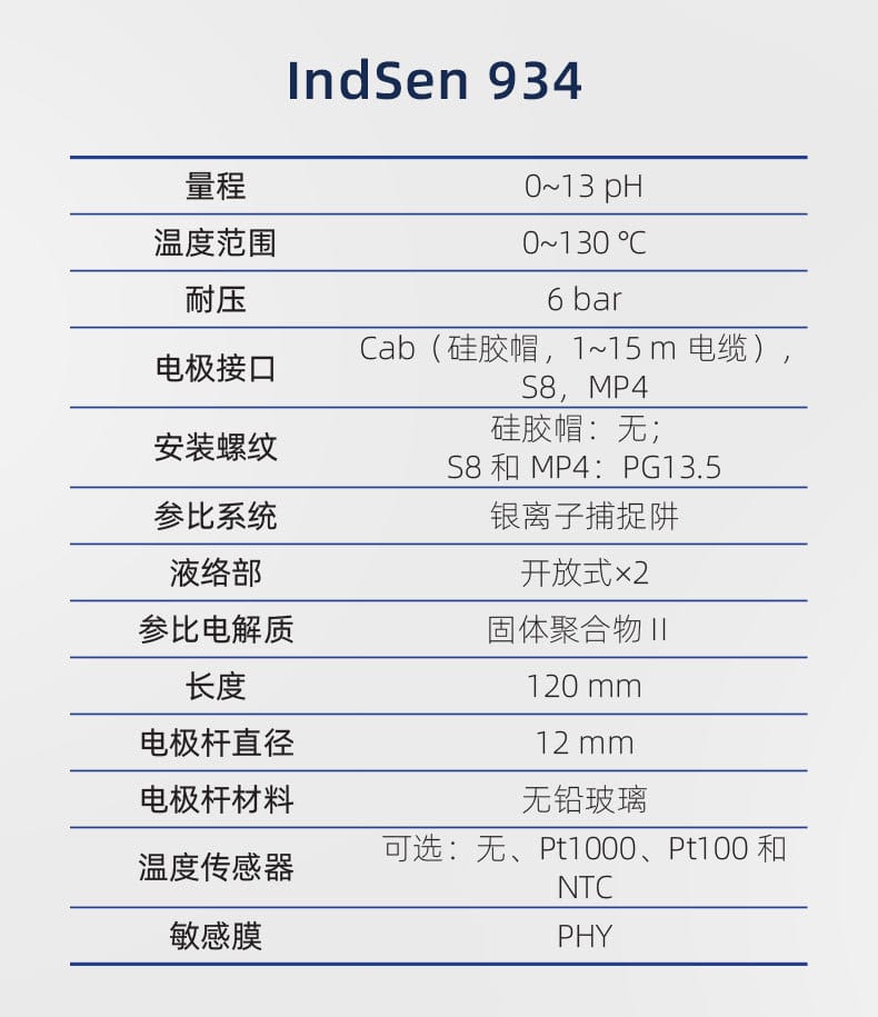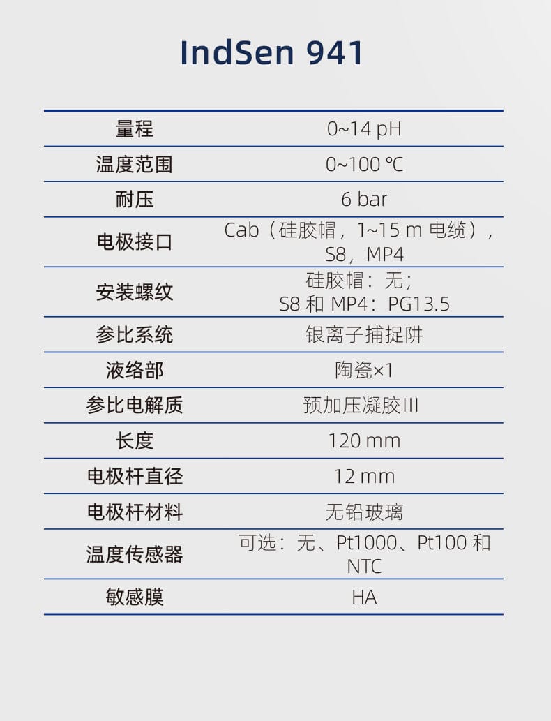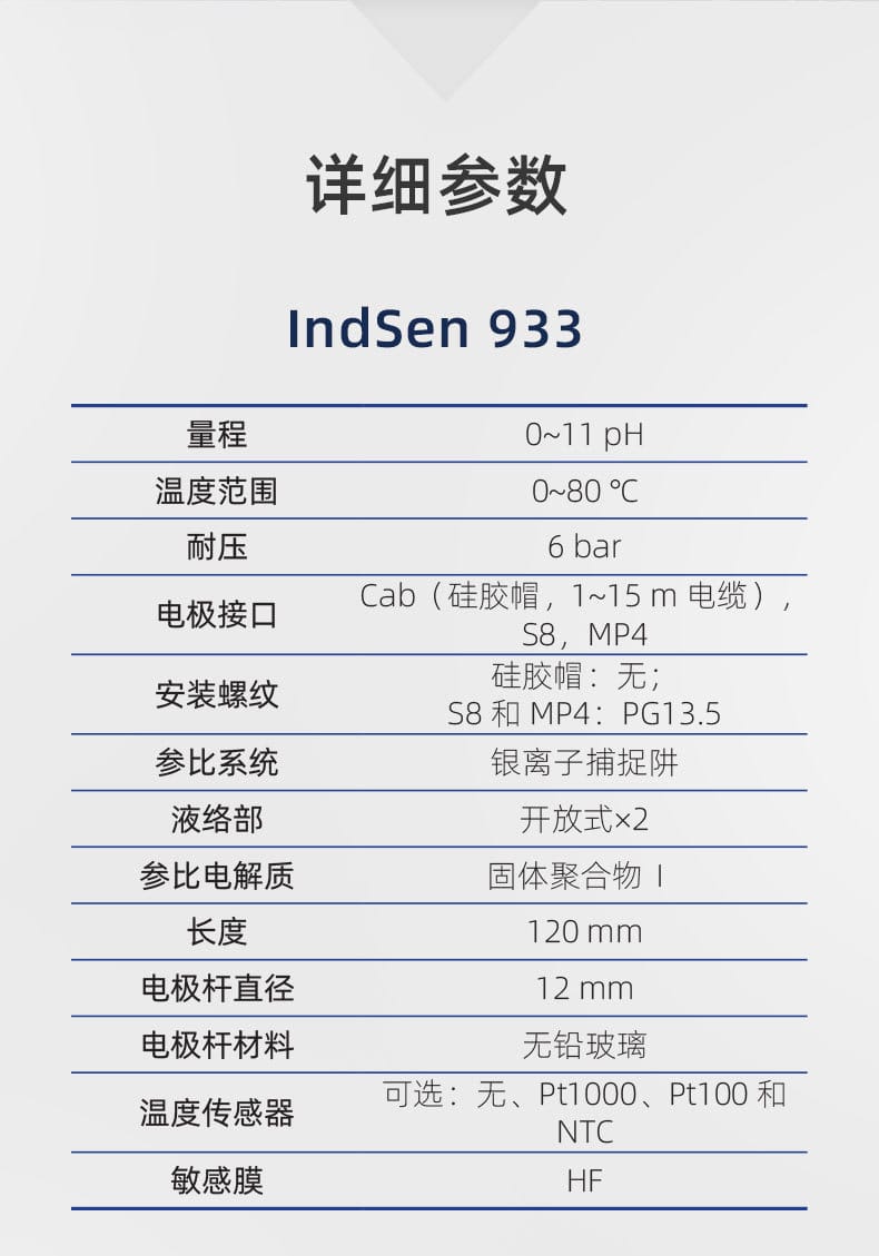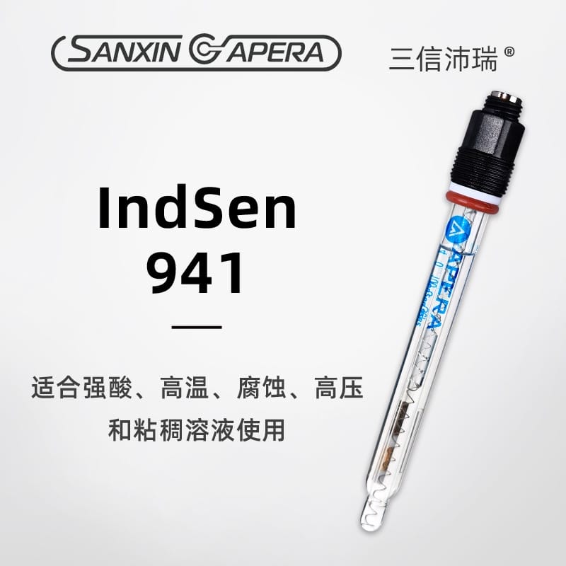 IndSen 933/934/941系列是上海三信(Sanxin)推出的高性能工业在线pH复合电极,专为强酸、高温、高压、腐蚀性和粘稠溶液等恶劣环境设计。产品采用厚膜化工艺,玻璃膜强度达普通电极的10倍以上,具备卓越的抗碰撞与耐化学性能。 - **IndSen 933**:配备HF玻璃膜,适用于氢氟酸及强酸溶液,量程0~11 pH,温度范围0~80℃,参比系统采用银离子捕捉阱,有效防止含硫介质堵塞。 - **IndSen 934**:搭载PHY玻璃膜,耐温高达130℃,适用于高温腐蚀性液体如电镀液,参比电解质为固体聚合物II,稳定性强。 - **IndSen 941**:采用预加压凝胶III电解质和骨瓷液络部,适合高压与高粘度介质,量程宽至0~14 pH,耐温达100℃。 全系列支持多种接口(Cab/S8/MP4)和温度传感器(Pt1000/Pt100/NTC),可实现自动温度补偿。外壳采用无铅玻璃,符合RoHS与CE认证,通过ISO 9001质量管理体系认证,广泛应用于化工、制药、废水处理、电力等行业。上海三信专注电化学分析30年,产品远销欧美日等50多个国家,品质值得信赖。