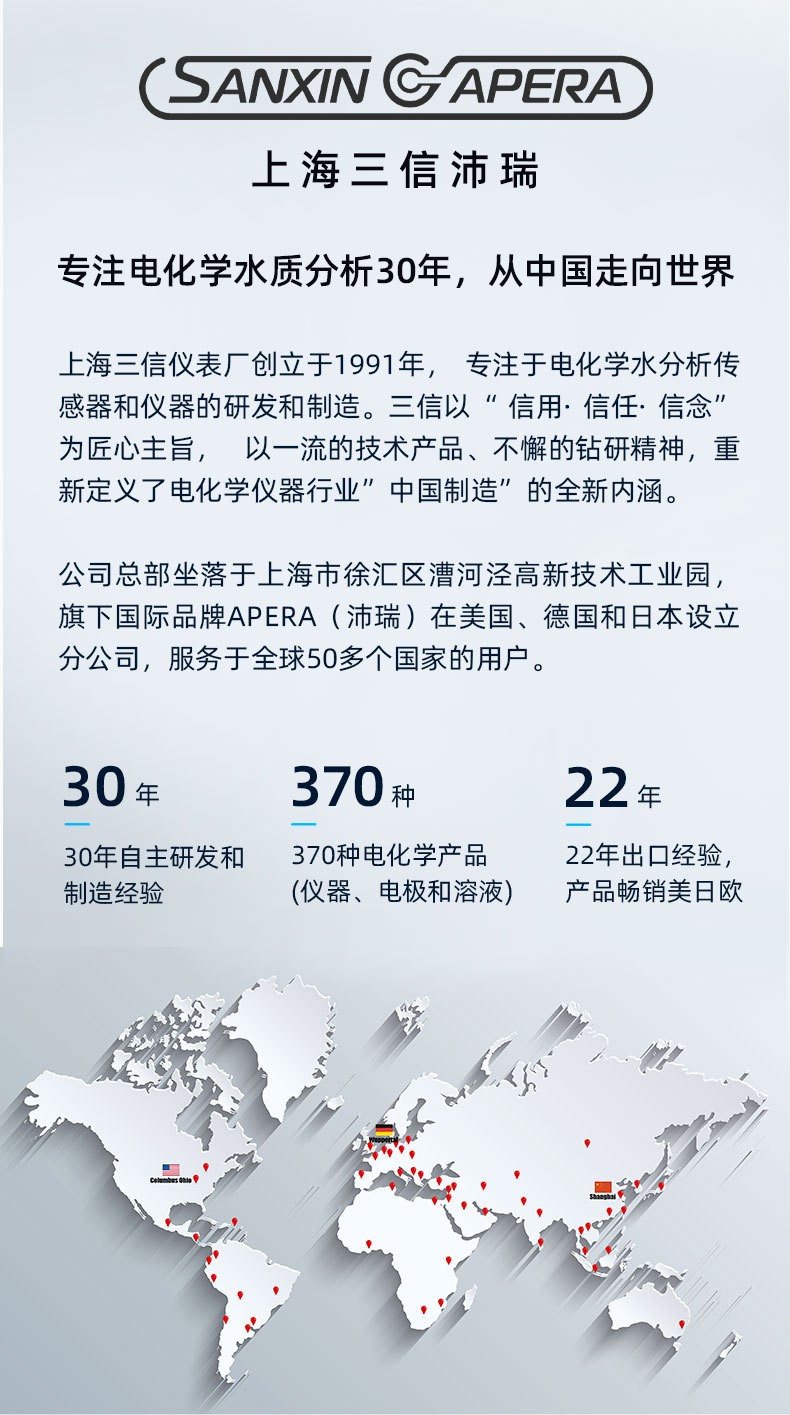 SANXIN CAPERA(上海三信沛瑞仪器科技有限公司)专注电化学水质分析30年,提供高品质电极架系列产品。本系列包括600型可升降电极架、601型搅拌式电极架和602型万向电极架,满足不同实验需求。 - **600型电极架**:由支杆、电极夹和底座组成,可同时放置三支电极(中16mm×2,中13mm×1),结构稳定,操作便捷。 - **601型搅拌式电极架**:具备0~2300转/分调速功能,最大搅拌容量达1000ml,配备DC6V电源适配器,有效提升pH及离子电极响应速度,避免气泡干扰。 - **602型万向电极架**:弧形支架支持360°旋转与垂直升降,采用ABS工程塑料与不锈钢轴心,坚固耐用,可放置四支电极(中16mm×3,中13mm×1),定位精准。 产品广泛应用于教育、科研、环境监测、饮品质量、水处理、水产养殖、游泳池及温泉等水溶液检测领域。通过CE、RoHS及ISO 9001:2015认证,品质可靠,原厂生产,全国联保2年。关注三信公众号可享在线技术支持。本店支持开具13%增值税专票或普票,订单满2000元赠定制皮革笔记本+水性笔,多件购买享折上优惠。