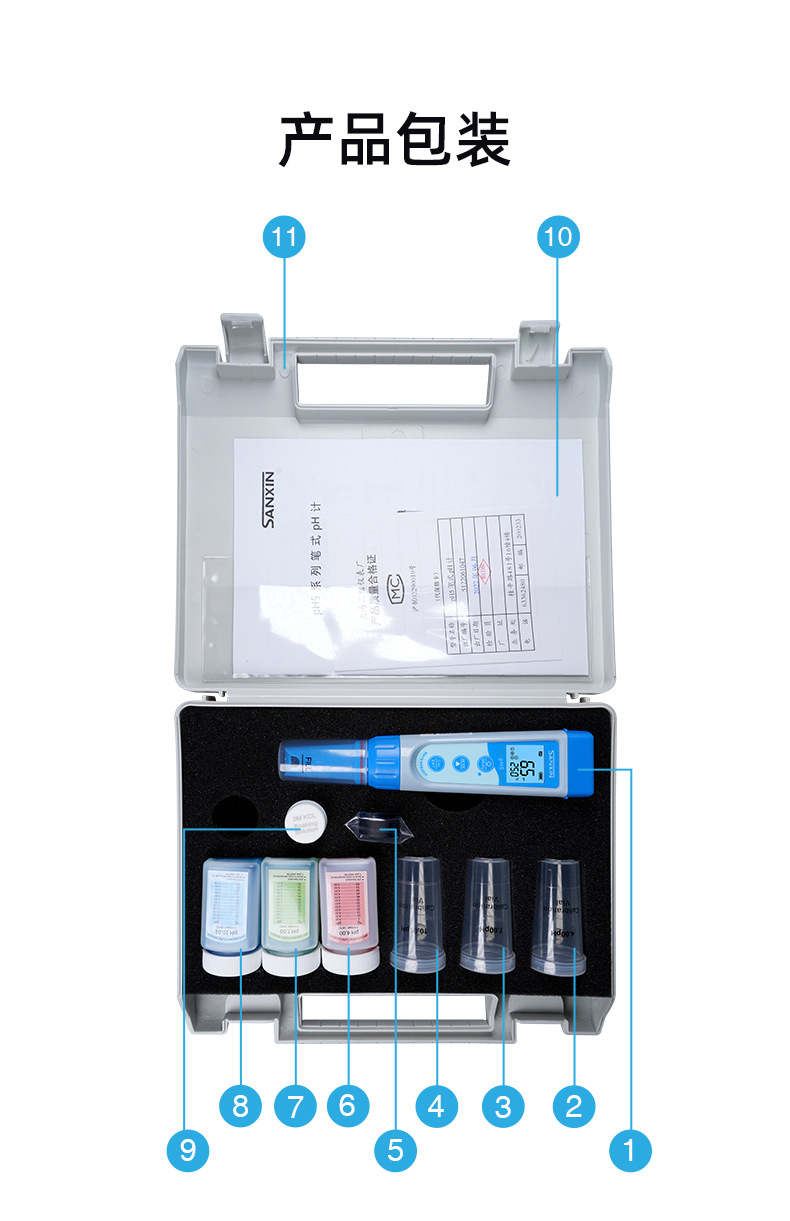 SANXIN(上海三信)pH5功能型笔式pH计是一款高精度、智能化的便携式pH测量仪器,专为现场及实验室环境设计。产品搭载锂玻璃pH电极,具备快速响应、低漂移特性,支持1~3点自动校准和自动温度补偿(0~50℃),确保测量结果准确可靠。 设备配备三色背光LCD显示屏(蓝色:测量模式;绿色:校准模式;红色:报警模式),支持读数锁定、低电压提醒及自动关机功能(8分钟无操作自动关闭)。整机达到IP67防尘防水等级,可漂浮于水面,适合复杂环境使用。 应用领域广泛,涵盖教育科研、环境监测、水处理、水产养殖、游泳池管理、饮品质量控制等。标配手提箱、校准溶液(pH4.00/7.00/10.01)、清洗液、挂绳及说明书,开箱即用。 本产品由拥有30年电化学分析经验的上海三信仪表厂制造,通过ISO 9001:2015、CE、RoHS等多项国际认证,远销美国、日本、欧洲等50多个国家。旗下品牌APERA在全球设有分支机构,品质值得信赖。 【售后服务】整机保修2年(自购买日起),支持7天无理由退换货(不影响二次销售)。本店可开具13%增值税专用发票或普通发票,请在下单时备注开票信息,未备注默认开具个人抬头普票。 【促销优惠】单件8.5折,两件8.2折,五件以上8折;订单满2000元赠送定制皮革笔记本+水性笔(价值50元)。