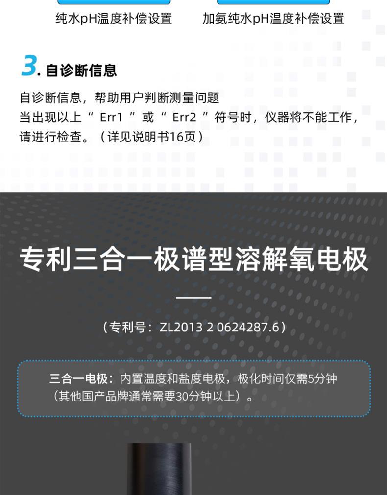 SANXIN(上海三信)MP525 pH/溶解氧测量仪是一款专业级电化学分析仪器,适用于常规水溶液的快速精确测量。该仪器具备pH、mV、溶解氧(DO)、温度等多参数测量功能,测量范围广,精度高:pH电计精度±0.002pH,溶解氧配套精度±0.40mg/L。支持自动温度、盐度和气压补偿,确保溶解氧测量更准确。 仪器配备瑞士LabSen Q211高端可充式玻璃pH电极,采用锂玻璃配方敏感膜,阻抗低、电位稳定,延长使用寿命。独特的三复合电极设计集成pH、参比与温度电极,实现自动温度补偿。溶解氧电极为专利三合一极谱型(专利号:ZL201320624287.6),内置温度与盐度传感器,极化时间仅需5分钟,大幅提升效率。 MP525支持1~3点自动校准,可识别中国、USA、NIST三大缓冲液系列,并提供纯水及加氨纯水pH测量模式,进行非线性温度补偿。具备600组GLP数据存储功能,支持手动或定时储存,并可通过RS232接口连接电脑传输数据。仪器符合IP54防尘防溅等级,配备硅胶保护帽,耐用性强。 标准配置包含智能搅拌器、多种电极、校准缓冲液及配件,满足实验室全面需求。整机享受2年保修,电极6个月保修。支持开具13%增值税专用发票,满2000元赠定制皮革笔记本+水性笔。三信专注电化学分析30年,产品出口美日欧,品质可靠,广泛应用于科研、环保、水务等领域。