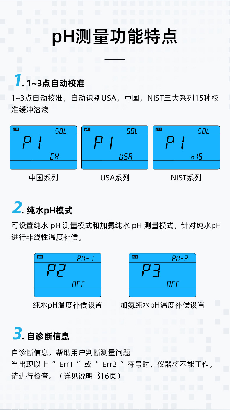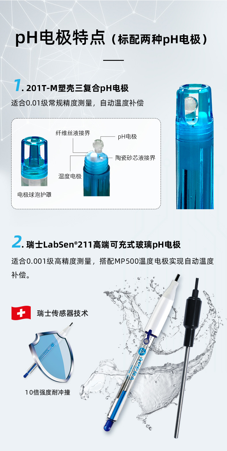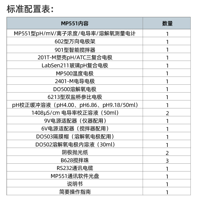SANXIN(上海三信)MP551台式多参数测量仪是一款高性能实验室分析仪器,专为精确测量pH、ORP、电导率、TDS、盐度、电阻率、溶解氧和离子浓度等十余种参数设计。采用先进的自动变频与非线性温度补偿技术,确保在纯水、高纯水等复杂环境下仍具备卓越测量精度。 产品配备两种pH电极:201T-M塑壳三复合电极适用于常规测量;瑞士LabSen®211高端玻璃电极则满足0.001级高精度需求。溶解氧测量采用专利三合一极谱型电极(专利号:ZL2013 2 0624287.6),集成温度与盐度补偿功能,极化时间仅需5分钟,大幅提升使用效率。 仪器支持1~3点自动校准,兼容中国、USA、NIST三大缓冲液体系,并具备自诊断功能,便于故障排查。内置300组GLP数据存储,配备RS232接口实现电脑通讯,支持数据导出与远程控制。整机符合IP54防尘防溅等级,配备硅胶保护帽,适应多种实验环境。 标准配置包含智能搅拌器、多种电极、校准溶液及配件,开箱即用。广泛应用于环保、水务、制药、食品等行业。品牌提供2年仪器保修、6个月电极保修服务,支持开具13%增值税专用发票,是实验室可靠、精准、高效的测量解决方案。