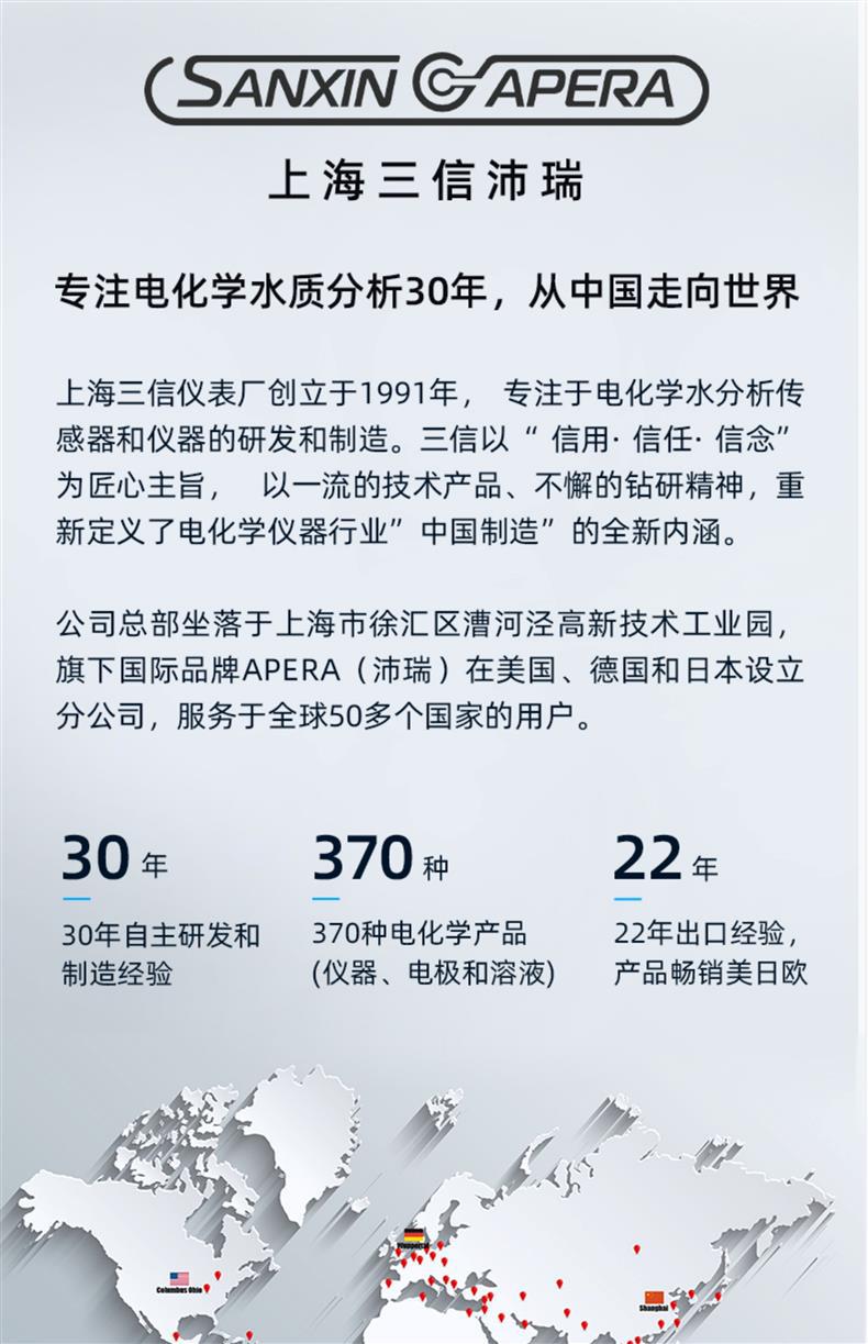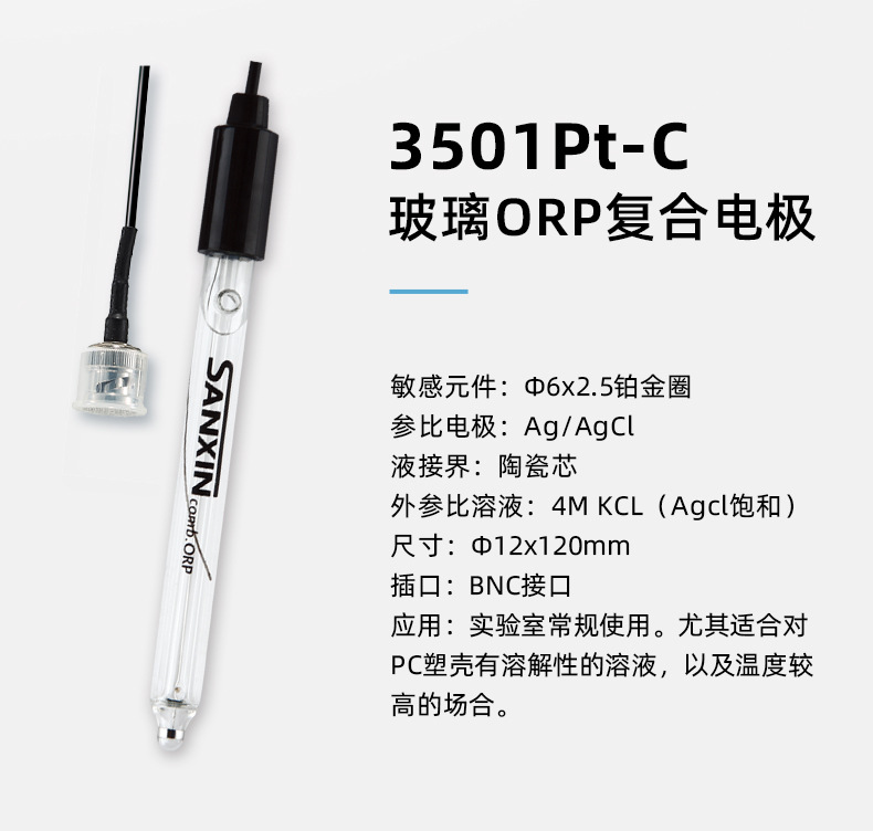 上海三信沛瑞(SANXIN CAPERA)专注电化学水质分析30年,专业研发制造pH复合电极、三复合电极及ORP电极等系列产品。主打型号包括201-C(BNC接口)、201-A(无导线BNC)、201T-M/F/S/Q(支持自动温度补偿的三复合电极),适用于各类台式与便携式pH计。采用锂玻璃敏感膜、陶瓷液接界与Ag/AgCl参比系统,具备低阻抗、响应快、稳定性高等特点。另提供3501Pt-C玻璃ORP电极、301Pt-C/S塑壳ORP电极及平面电极2015P-C,满足实验室、水处理、环境监测、食品饮料、电力泳池等多领域精准测量需求。产品通过ISO9001、CE、RoHS认证,原厂生产,品质可靠。支持7天无理由退换,整机2年保修,可开具13%增值税专用发票。