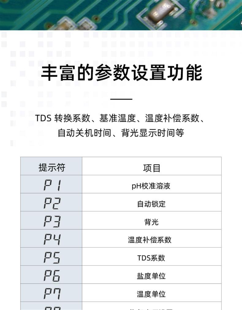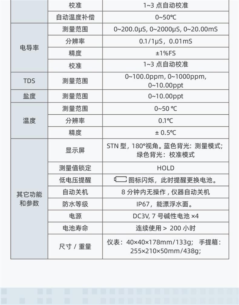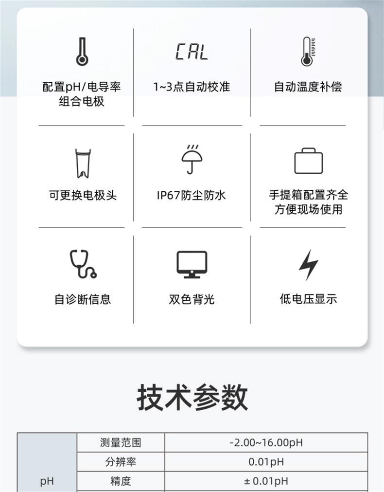 SANXIN(上海三信)PC5笔式pH/电导率仪是一款高精度、多功能的便携式水质分析仪器,专为现场快速检测设计。仪器集成pH、电导率、TDS、盐度和温度五项参数测量,配备可更换组合电极,支持1~3点自动校准与0~50℃自动温度补偿,确保测量准确稳定。 产品采用智能芯片设计,具备双色背光LCD显示屏(蓝色:测量模式,绿色:校准模式)、读数自动锁定、低电压提醒及8分钟无操作自动关机功能,提升使用便捷性。整机达到IP67防尘防水等级,可漂浮于水面,适应复杂环境使用。 标配手提箱、校准溶液、清洗液等全套配件,广泛应用于教育科研、环境监测、饮用水管理、水产养殖、游泳池维护等多个领域。三信专注电化学分析30年,产品畅销美日欧,通过ISO9001:2015认证,品质可靠,原厂提供2年质保。 品牌:SANXIN 上海三信(品牌编码:81),国际品牌APERA联合出品,中国制造,全球服务。