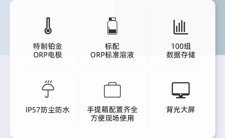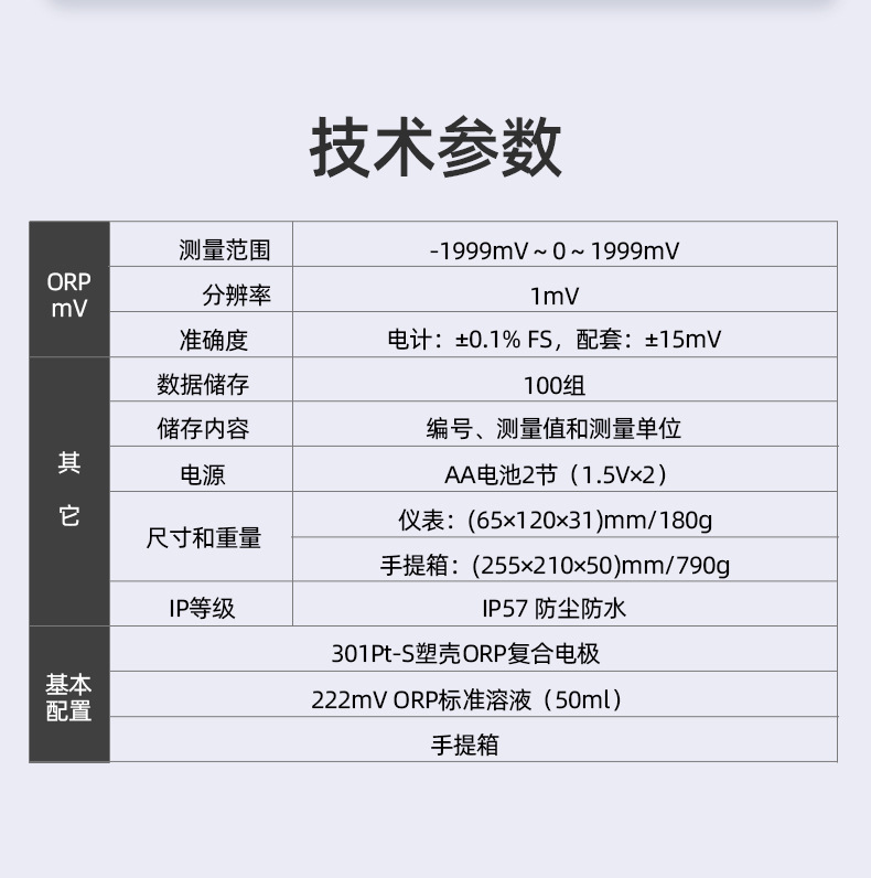 SANXIN(上海三信)SX712便携式ORP测量仪是一款专为现场快速、高精度测量ORP(氧化还原电位)设计的专业仪器。该设备广泛应用于教学科研、环境监测、水处理、泳池管理等领域,畅销美国、日本、欧洲等国际市场。 核心配置包括特制铂金301Pt-S塑壳ORP复合电极,响应快、漂移低、稳定性强,无需频繁校准,便于清洗维护。标配222mV ORP标准溶液,可用于电极性能检测与活化,确保测量准确性。 仪器支持100组数据存储,记录编号、测量值及单位;配备背光大屏,方便在弱光环境下读数;整机达到IP57防尘防水等级,坚固耐用。整套设备收纳于专用手提箱中,携带便捷,适合户外作业。 技术参数: - 测量范围:-1999mV ~ +1999mV - 分辨率:1mV - 准确度:电计±0.1%FS,配套±15mV - 电源:2节AA电池 - 尺寸/重量:仪表(65×120×31)mm / 180g;手提箱(255×210×50)mm / 790g - 防护等级:IP57 基本配置:SX712电计、301Pt-S复合ORP电极、222mV标准溶液(50ml)、手提箱、说明书等。 上海三信专注电化学水质分析30年,通过ISO 9001:2015、CE、RoHS等多项国际认证,产品远销全球50多个国家。旗下品牌APERA在美、德、日设有分公司,提供全方位技术支持。 售后服务:仪器享2年保修,电极6个月保修;支持7天无理由退换货;可开具13%增值税专用发票。关注官方公众号即可享受在线技术支持。