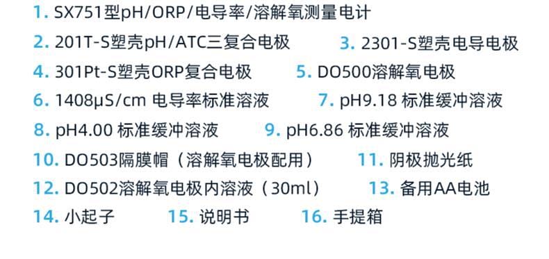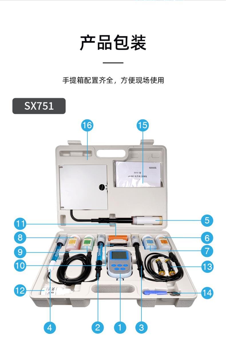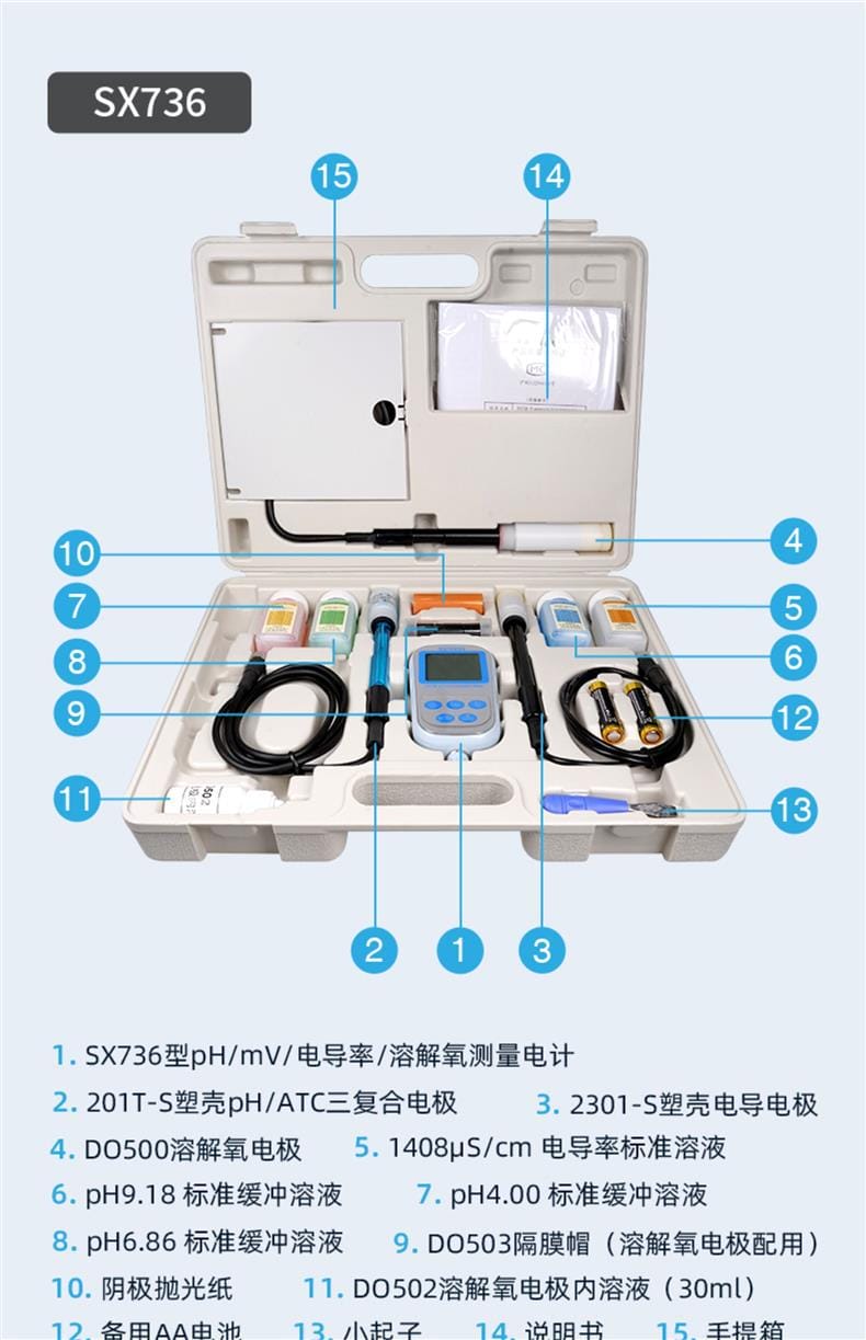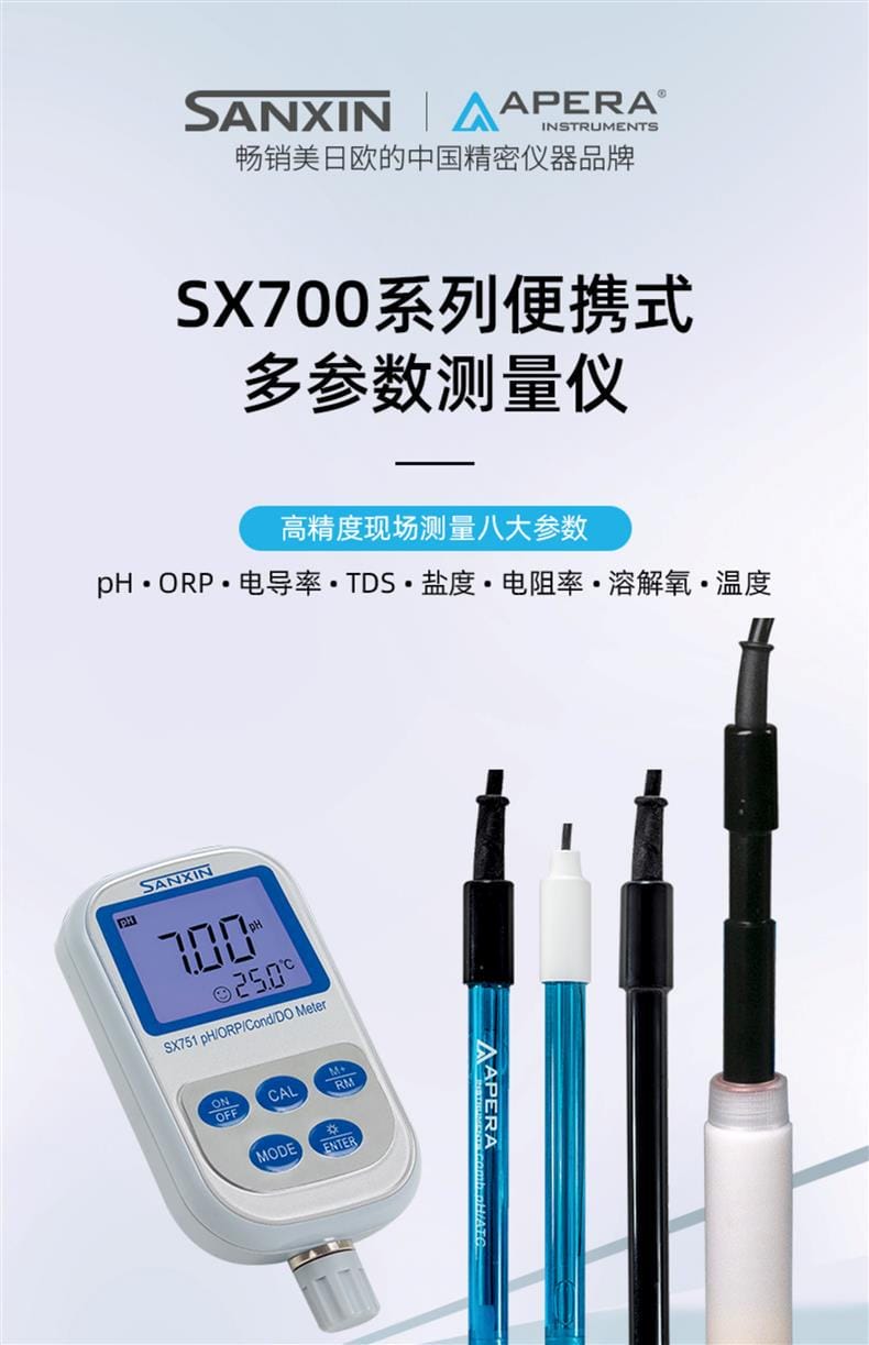 上海三信(SANXIN)APERA SX700系列便携式多参数测量仪是一款高性能水质分析设备,可精确测量pH、ORP、电导率、TDS、盐度、电阻率、溶解氧和温度八大参数,广泛应用于环境监测、水处理、电力、石化、科研教学及水产养殖等领域。 该系列包含SX731、SX736、SX751三种型号,均具备自动1~3点校准、自动温度补偿、大屏背光显示、数据存储(300~400组)及IP57防尘防水等级,适合各种复杂现场环境使用。配备高品质复合电极,包括201T-S三合一pH电极、2301-S坚固型铂黑电导电极、301Pt-S ORP电极和DO500溶解氧电极,确保测量快速、稳定、准确。 特色功能包括: - 自动识别13种pH缓冲液,支持中国/USA/NIST标准; - 纯水及加氨纯水pH测量模式,提升低离子样品测量精度; - 电导率一键切换至TDS、盐度、电阻率; - 溶解氧自动温度、盐度补偿,支持满度、零氧校准; - 专利三合一极谱法溶解氧电极(专利号:ZL201320624287.6),极化仅需5分钟; - 内置自动变频技术,K=1电极可覆盖0~200mS/cm宽量程; - 标配手提箱,配置齐全,便于携带与现场操作。 产品通过ISO9001:2015、CE、RoHS认证,整机保修2年,电极保修6个月。支持开具13%增值税专用发票,订单满2000元赠送定制皮革笔记本+水性笔。三信专注电化学分析30年,产品远销欧美日等50多个国家,是中国精密制造的典范品牌。