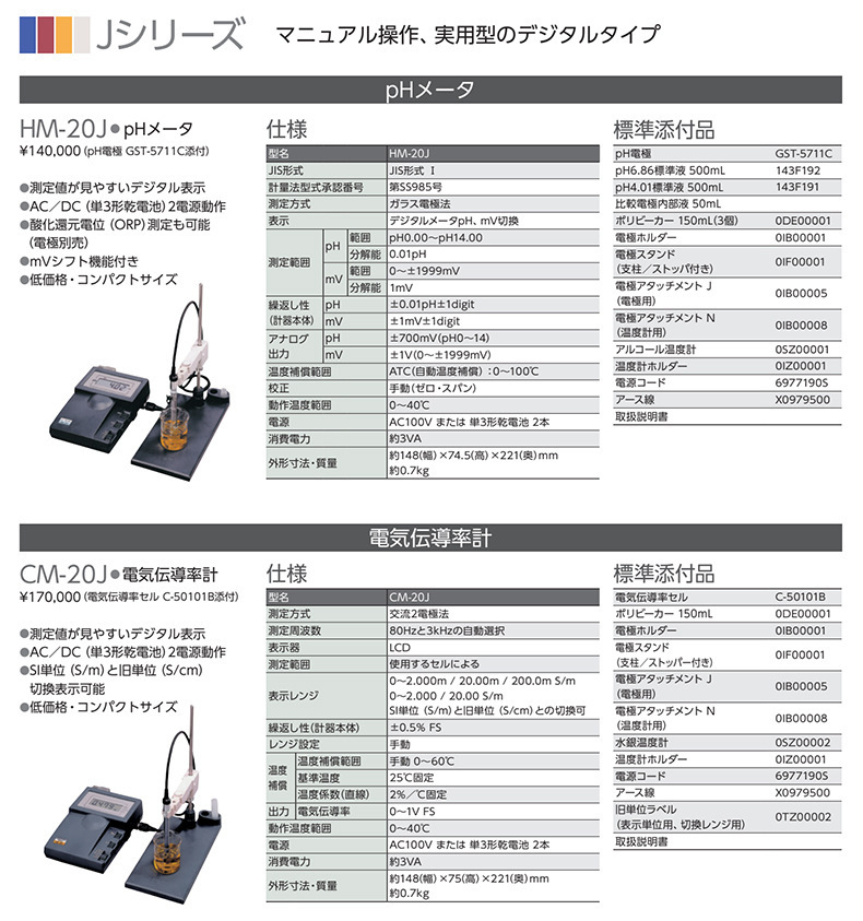 任氏(JENCO)推出实用型水质分析仪器HM-20J pH计与CM-20J电导率仪,专为实验室及现场检测设计。HM-20J采用复合电极法,测量范围pH 0.00~14.00,分辨率0.01pH,具备mV测量及ORP功能,并支持自动温度补偿(ATC)。CM-20J电导率计采用交流两极法,测量范围宽,支持SI单位与传统单位切换,温度补偿可手动设定。两款仪器均配备LCD显示屏,AC/DC双电源供电(含干电池),适合多种环境使用。标准配置包含电极、标准缓冲液、电极支架、温度传感器及电源适配器,满足即用需求。外形紧凑,操作简便,是高性价比的水质检测解决方案。