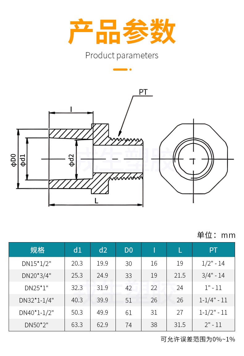 HERSHEY(环琪塑胶集团)PT7L系列UPVC外丝直接,采用化工级/工业级优质UPVC颗粒一体成型,管壁加厚设计,具备优异的耐酸碱、耐腐蚀性能和高机械强度。产品精密制造,内壁光滑,流体阻力小,具有良好的密封性和不透光性,适用于高要求工业环境。 【主要特性】 - 工业加厚处理,抗压耐磨 - 高纯度UPVC材质,环保无毒 - 一体成型工艺,结构坚固耐用 - 内壁光滑,减少流阻,防止结垢 - 耐化学腐蚀,适用于多种介质传输 【规格参数】 | 规格 | d1 | d2 | DO | 1 | L | PT | |------|----|----|----|---|----|-----| | DN15*1/2" | 20.3 | 19.9 | 30 | 16 | 19 | 1/2"-14 | | DN20*3/4" | 25.3 | 24.9 | 33 | 19 | 21.5 | 3/4"-14 | | DN25*1" | 32.3 | 31.9 | 42 | 22 | 24 | 1"-11 | | DN32*1-1/4" | 40.3 | 39.9 | 51 | 26 | 26 | 1-1/4"-11 | | DN40*1-1/2" | 50.3 | 49.9 | 61 | 31 | 27 | 1-1/2"-11 | | DN50*2" | 63.3 | 62.9 | 74 | 38 | 31.5 | 2"-11 | 【应用领域】 广泛应用于电子制造(如半导体、LCD、集成电路)、药品生产(医用纯水、无菌水)、化工合成(化肥、精细化工、化妆品)以及高端制造(电镀、镀膜玻璃、印染)等行业,是工业流体系统中理想的管道连接解决方案。