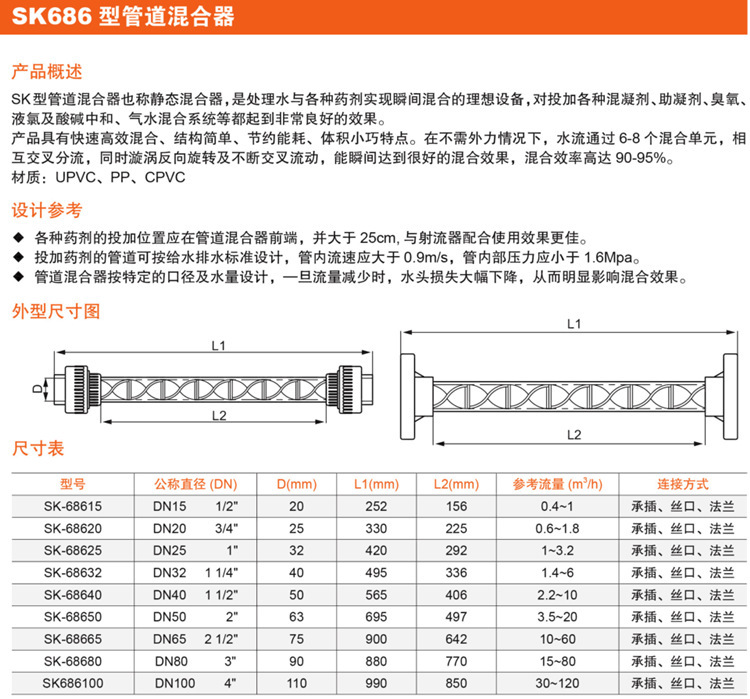 Lige SK686型管道静态混合器(又称静态混合器)是水与各类药剂瞬间混合的理想设备,广泛应用于水处理、石油化工、制药、食品生产等领域。该混合器采用UPVC、PP、CPVC等耐腐蚀材质制造,具备防酸耐碱、结构紧凑、无需外力驱动、节能高效等特点。 水流通过6-8个SK高效混合单元时,实现交叉分流与旋流反向运动,可在极短时间内完成充分混合,混合效率达90%-95%。适用于混凝剂、助凝剂、臭氧、液氯投加及酸碱中和、气水混合等系统。 产品提供DN15-DN400多种规格,连接方式包括承插、丝口、活接式与法兰式,支持非标定制。配合射流器使用效果更佳,加药系统组合更高效。 安装简便,维护成本低,符合国标及国际管材标准(DIN、ANSI、JIS、BS等)。适用于矿业、冶金、医药、机械等多个行业,确保安全环保、品质稳定、售后无忧。