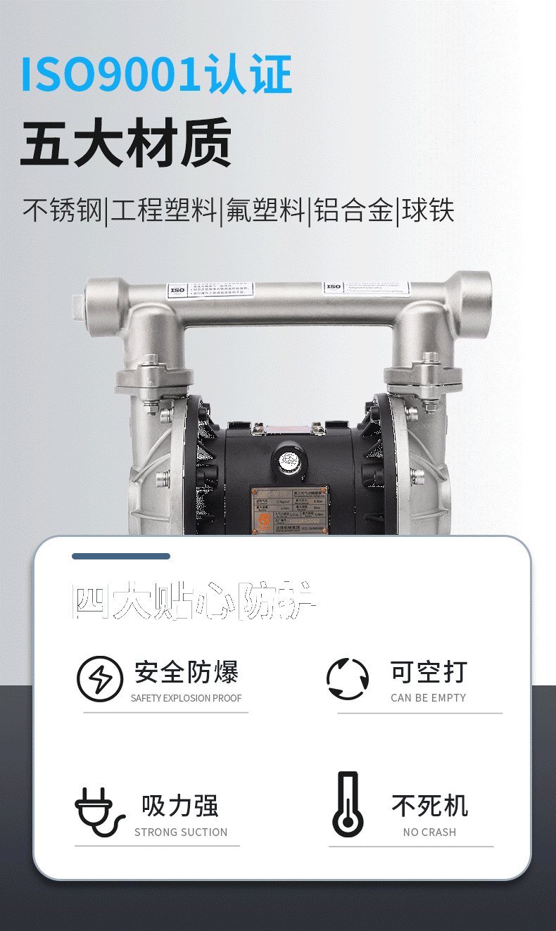 阔思(KUOSI)QBY3系列气动隔膜泵是一款高性能、耐腐蚀的工业级泵类产品,适用于输送强酸、强碱及其他腐蚀性液体。产品具备大流量、大压力、低噪音、抗腐蚀、寿命长等八大优势,配备升级马达体,运行稳定不卡气,可空转不死机,维护成本低。提供不锈钢、工程塑料、氟塑料、铝合金、球铁五种材质选择,满足多种工况需求。通过ISO9001、CE、浙江制造、防爆合格等多项国际认证,品质可靠。广泛服务于中粮、徐工、比亚迪、中国石油、国药集团等世界500强企业。总部位于浙江嘉兴,支持现货发货及海内外配送,提供专业售后团队服务,是行业信赖的隔膜泵专家。