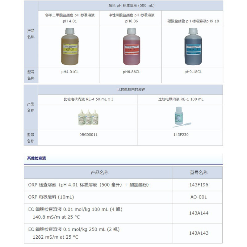 任氏(JENCO)提供全套pH标准溶液与参比电极内填充液,确保pH测量的高精度与稳定性。产品包括:草酸盐(pH 1.68)、邻苯二甲酸盐(pH 4.01)、中性磷酸盐(pH 6.86)、硼酸盐(pH 9.18)和碳酸盐(pH 10.02)标准溶液,每种均为500mL配制量,采用高纯度粉末试剂(5袋装),方便快捷溶解使用。同时提供颜色标识的标准溶液,提升操作安全性与识别效率。参比电极内液包含RE-4(50mL×3)和RE-1(100mL)两种规格,适配多种电极型号。另配备ORP校准溶液(含醌氢醌粉)及电极清洁磨料,以及电导率(EC)校准液(0.01 mol/kg 和 0.1 mol/kg),全面满足水质分析仪器的维护与校准需求。