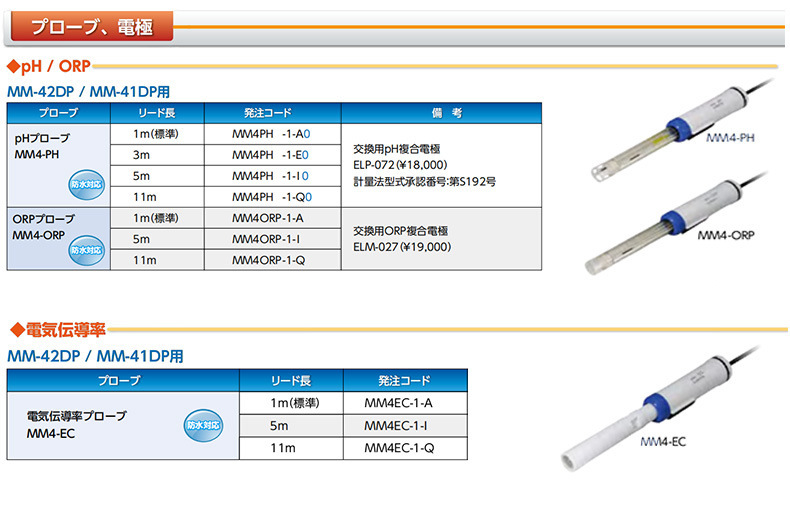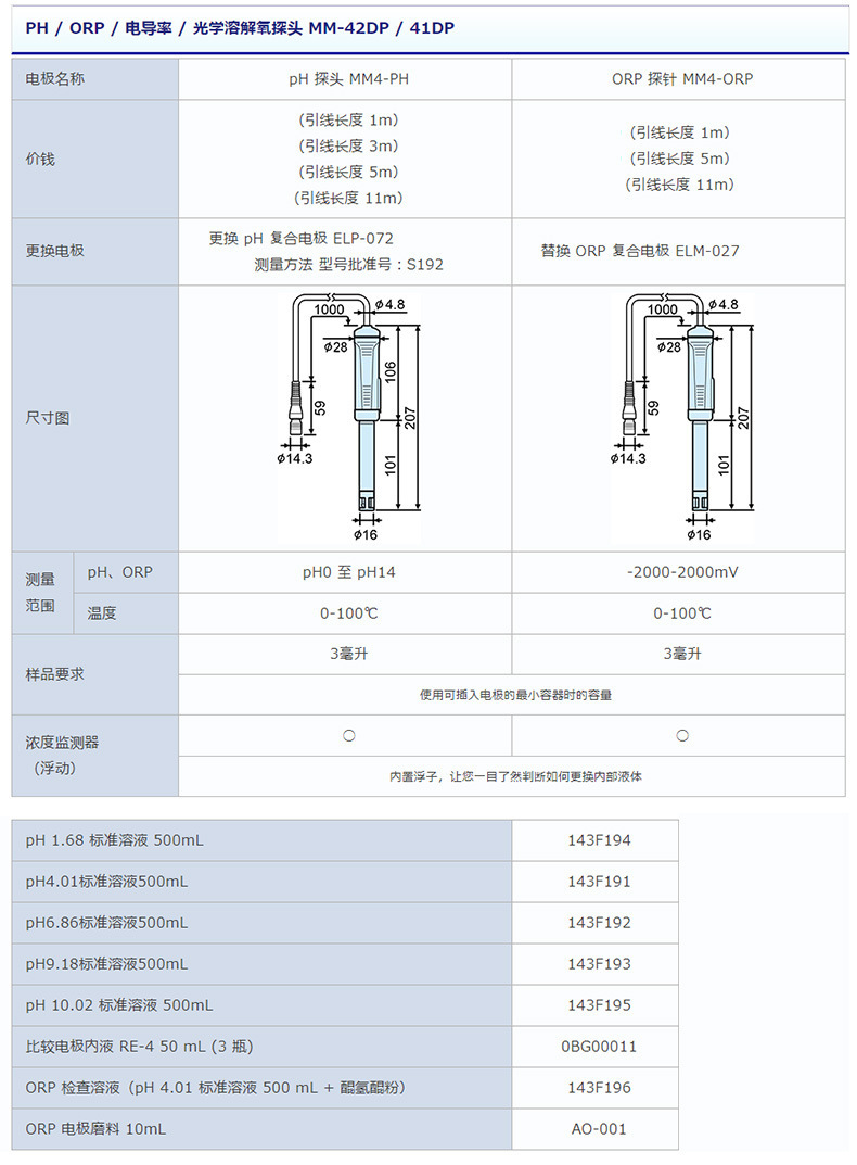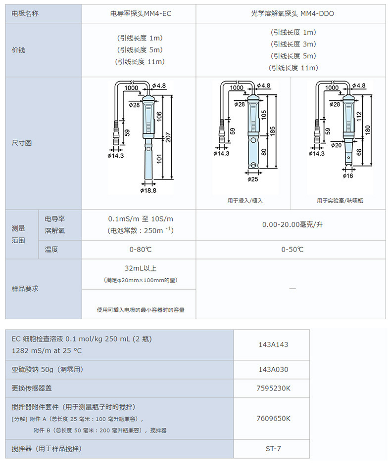 本系列产品为上泰(SUNTEX)专为MM-42DP/41DP仪表设计的pH、ORP、电导率及光学式溶解氧探头,适用于浸渍或投入式测量场景。pH探头(MM4-PH)与ORP探头(MM4-ORP)配备复合电极,测量范围分别为pH 0~14和-2000~+2000mV,温度可达100℃;电导率探头(MM4-EC)电极常数为250 m⁻¹,测量范围0.1 mS/m至10 S/m;光学溶解氧探头(MM4-DDO)采用无隔膜、无电解液技术,无需频繁维护,支持干燥保存,测量范围0.00~20.00 mg/L,适用于BOD测定。所有探头标准总长1000mm,插入部直径φ14.3mm,适配最小样品量≥3mL(pH/ORP)或≥32mL(电导率)。配套提供校准溶液、搅拌附件套件及传感器更换部件,确保测量准确性与操作便捷性。