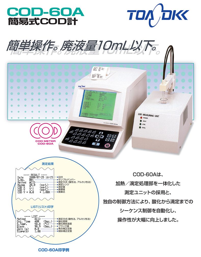 SEKO COD-60A简易式COD测定仪是一款高度自动化的水质分析设备,专为化学需氧量(COD)的快速准确测定设计。仪器采用一体化酸化与滴定处理系统,仅需将样品和试剂加入测定容器,按下启动键即可自动完成加热、氧化、冷却和电量滴定全过程,显著提升操作便捷性并减少人为误差。
