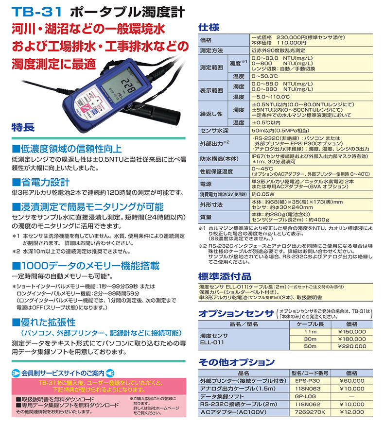 任氏(TOA DK)TB-31便携式浊度计是一款专为环境水体浊度测量设计的高可靠性仪器,特别适用于河川、湖沼、砂场排水和工程排水等场景。该仪器在低浓度范围(0.0~80.0NTU)内测量精度高达±0.5NTU,显著提升测定信赖性。采用近红外90度散射光法,有效减少色度干扰,确保测量准确性。 TB-31配备省电设计,使用两节AA型干电池可持续工作约120小时,并支持直接浸入水中进行快速测定(短时间连续测量可达24小时),防护等级达IP67(1米水深30分钟浸泡),适合野外与现场使用。仪器支持自动记录功能,可设置1秒至99小时59分的定时测量间隔,便于长期数据采集。 设备具备RS-232C接口和模拟输出功能,可连接外部记录仪或EPS-P30打印设备,实现数据外输。标准配置包括ELL-011浊度传感器(2m电缆)、保护套、干电池及说明书。另有11m、30m、50m延长探头可选,满足不同深度测量需求。同时提供AC适配器、输出线缆等配件,扩展应用灵活性。 购买后注册用户可享受免费专用数据记录软件下载及其他会员专属服务,助力高效水质管理。