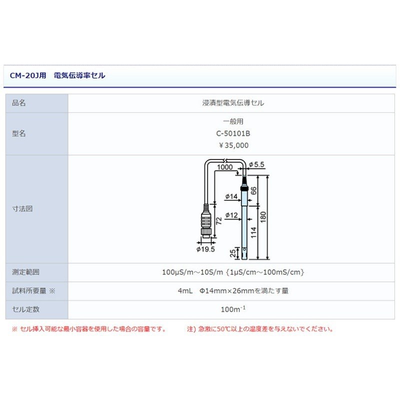 三信CM-20J浸渍型电导率仪,型号C-50101B,适用于一般用途的电导率测量。测量范围为100μS/m至10S/m(等同于1μS/cm至100mS/cm),重复性优异。设备所需样品量仅为4mL,采用Φ14mm×26mm专用样品池设计,便于操作与清洗。电极常数为100m⁻¹,适合多种液体电导率检测。产品尺寸适配SS标准接口,价格为35,000日元,广泛应用于水质分析、工业过程控制等领域,确保测量准确可靠。