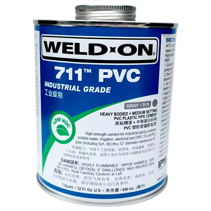 WELDxON 711T 工业级UPVC胶粘剂是专为高强度管道连接设计的高性能溶剂型胶水,适用于工业级别PVC、CPVC及重型管材的粘接。产品符合美国IPS标准,具备超强粘接力和耐环境变化能力,广泛应用于市政给水、生活用水、高尔夫球场灌溉、水处理设备、污水处理及建筑通风系统等场景。即使在低至-26℃的寒冷环境中,配合专用预粘剂与727 Hot 'R Cold工艺,仍可实现稳定粘接。本品为重型体配方,固化后密封性强,耐压耐腐蚀,通过饮用水安全认证,安全环保。规格:946ml(32 oz),颜色有透明与灰色可选。厂家直销,库存充足,支持多种工业场景应用。