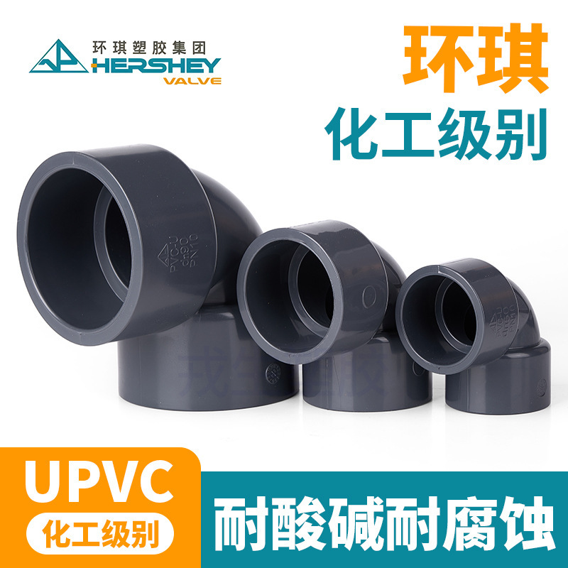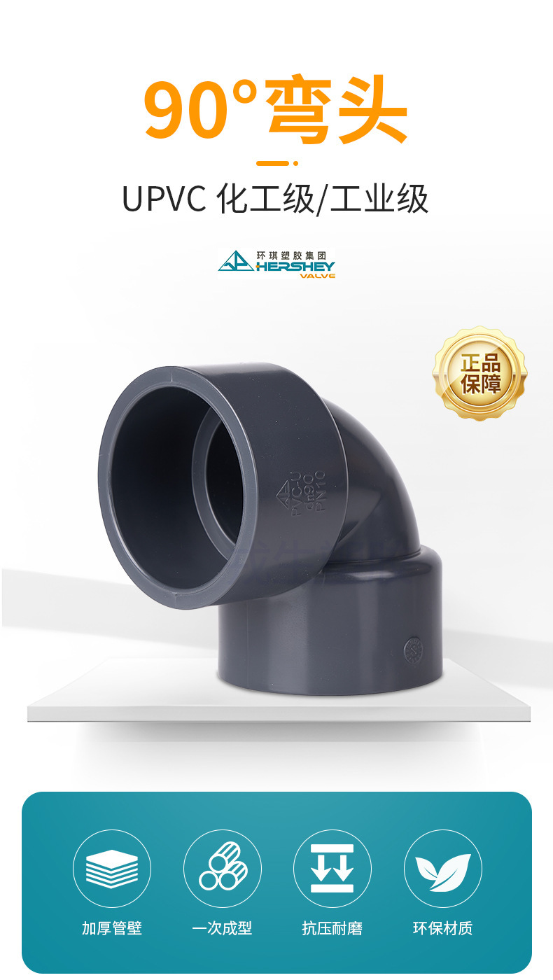 环琪塑胶集团(HERSHEY)出品的UPVC 90°弯头,采用优质UPVC颗粒一体成型,管壁加厚,内壁光滑,具备优异的抗压、耐磨和耐腐蚀性能。产品符合化工级/工业级标准,广泛应用于电子制造(如半导体、液晶显示器)、药品生产(医用纯水、无菌水)、化工合成(化肥、精细化工)以及高端制造(电镀、镀膜玻璃)等领域。精密制造工艺确保尺寸精准,密封性强,同时具备不透光性和环保特性,是工业管道系统的理想选择。