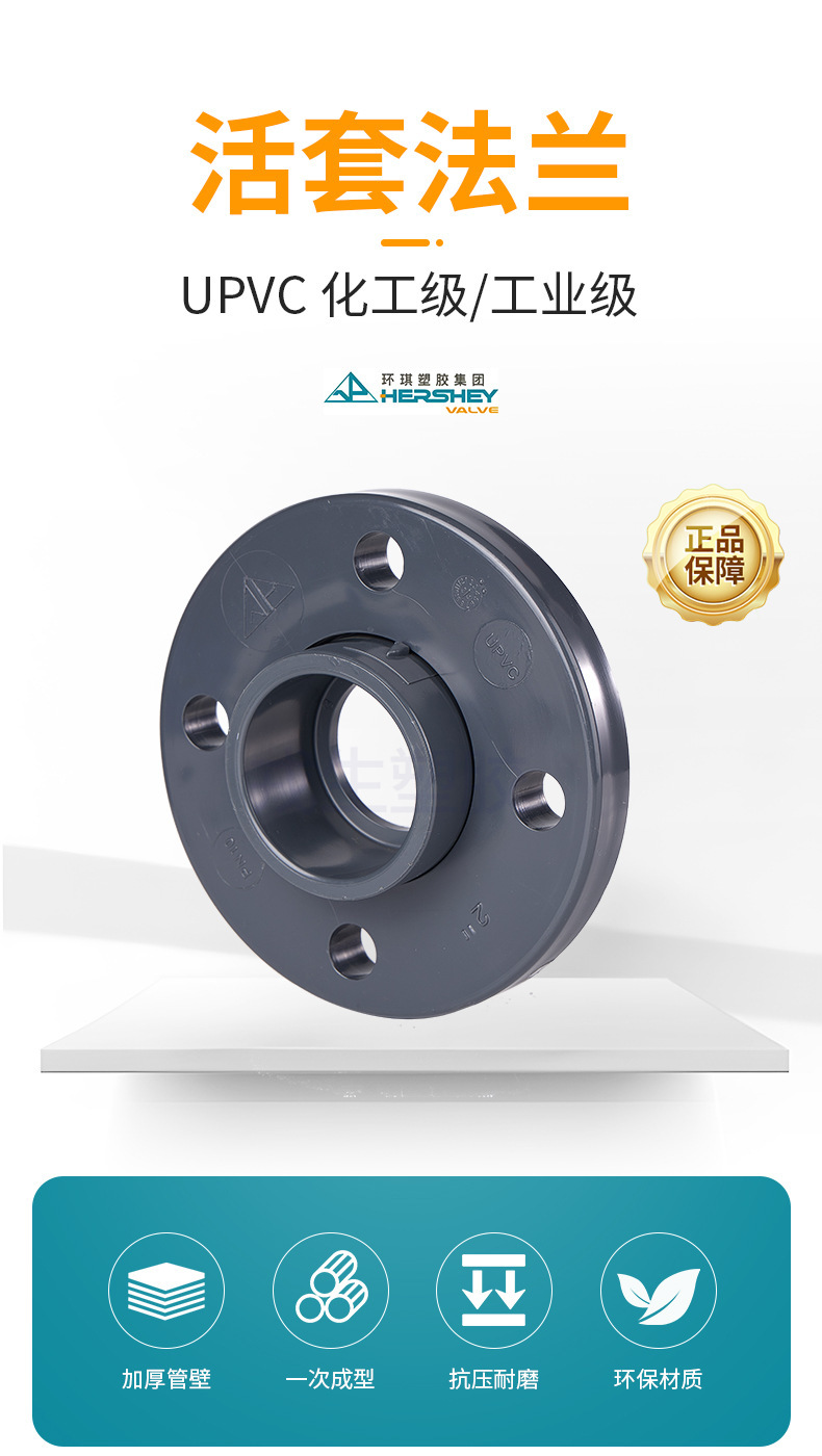 环琪(HERSHEY)活套法兰,采用化工级/工业级优质UPVC材料,6mm加厚管壁一次成型,具备优异的抗压性与耐磨性。产品选用精密制造工艺与高纯度UPVC颗粒,内壁光滑,流体阻力小,具有良好的耐酸碱、耐腐蚀性能和不透光性。广泛应用于半导体、电子工业、集成电路、液晶显示器、医药制剂、化工反应冷却、电镀工艺、化妆品制造等高端工业领域。环保材质,安全可靠,是工业管道系统中理想的连接解决方案。