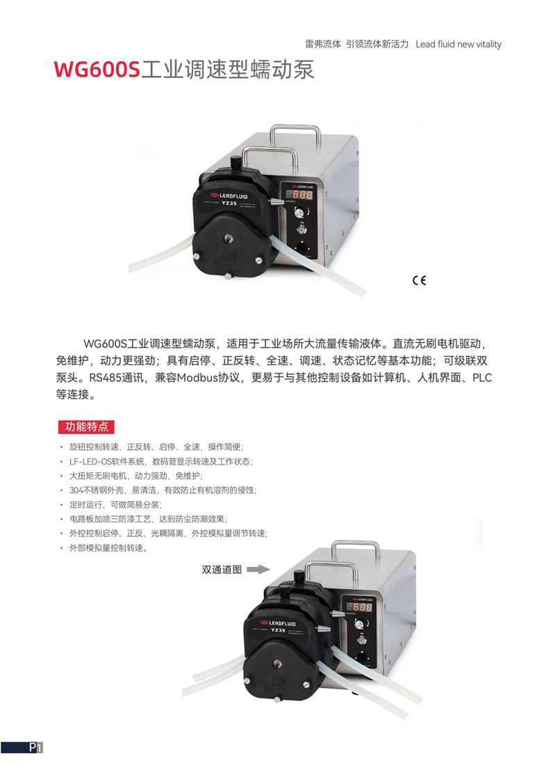 WG600S工业调速型蠕动泵由爱力浦(AILIPU)推出,专为工业场所大流量液体传输设计。采用高性能直流无刷电机驱动,动力强劲且免维护;支持启停、正反转、全速、调速及运行状态记忆等实用功能,操作便捷。配备LF-LED-OS智能显示系统,通过数码管实时显示转速与工作状态。设备支持单泵或级联双泵头配置,兼容YZ35泵头,最大流量可达13.2L/min(使用73#或82#软管)。内置RS485通讯接口,支持Modbus协议,可轻松对接PLC、人机界面及计算机控制系统。提供外控数字电平输入(5V/12V标配,24V选配)和模拟量输入(0-5V标配,0-10V/4-20mA选配),实现远程启停、方向控制和无级调速。整机采用304不锈钢外壳,耐腐蚀、易清洁,内部电路板喷涂三防漆,具备良好防尘防潮性能。防护等级达IP31,适应多种工业环境。广泛应用于化工、环保、水处理、制药等领域,是自动化流体输送的理想选择。