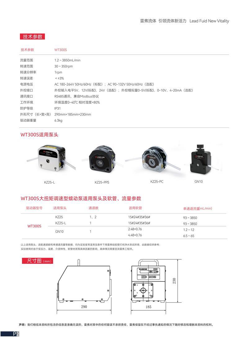 阔思WT300S是一款高性能大扭矩调速型蠕动泵,流量范围为1.2~3850 mL/min,转速可在30~350 rpm之间无级调节,分辨率精确,误差小于±3%。支持多种电源输入(标配AC 180-264V,选配AC 90-132V),配备标准5V/12V外控电平和0-5V模拟量输入,可选配24V电平及4-20mA信号,兼容性强。设备配备RS485通讯接口,支持Modbus协议,便于系统集成与远程控制。工作环境温度0~40℃,防护等级IP31,适合多种工业环境。外形尺寸为290mm × 185mm × 230mm,驱动器重量6.3kg。WT300S适配KZ25、KZ25-L、GN10等多种泵头,配合不同软管可实现1.2~3850 mL/min的广泛流量输出。实验室测试数据基于雷弗硅胶管与纯净水,实际应用中建议根据压力、介质特性等因素咨询专业工程师进行选型。