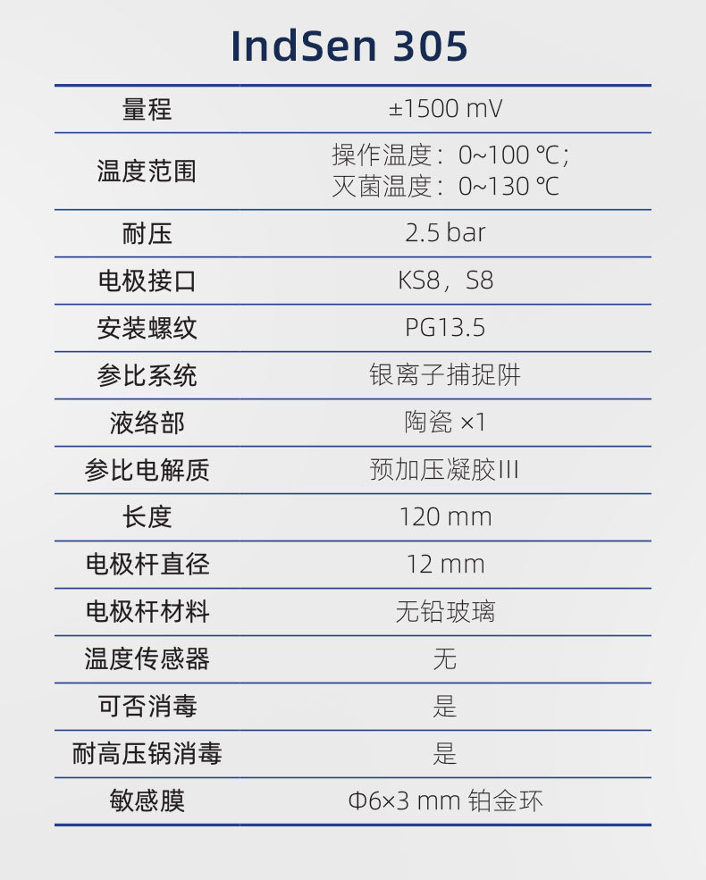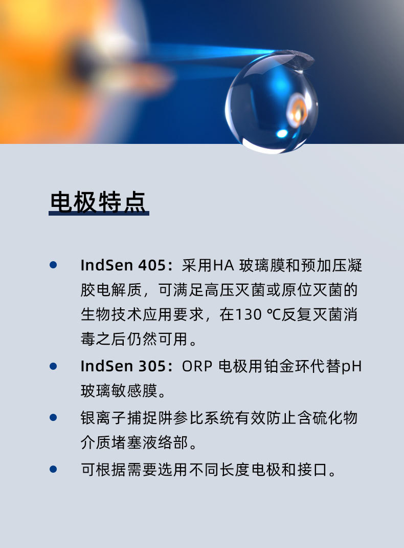 三信IndSen 405/305系列工业在线pH/ORP复合电极专为生物技术和制药行业设计,具备高耐压、耐高温和长寿命特性。IndSen 405采用HA玻璃膜和预加压凝胶Ⅲ电解质,可在130℃反复灭菌后仍保持性能稳定;IndSen 305则使用铂金环作为敏感元件,适用于ORP测量。双液络部结构搭配银离子捕捉阱参比系统,有效防止含硫介质堵塞,延长电极使用寿命。电极耐压达2.5 bar,操作温度0~100℃,灭菌温度可达130℃,满足高压灭菌(SIP/CIP)要求。外壳采用无铅玻璃材质,直径12mm,长度120mm,接口为KS8/S8,安装螺纹PG13.5,支持浸入式或流通式安装。产品通过CE、ISO 9001:2015及RoHS认证,品质可靠,广泛应用于生物制药、化工、饮料、废水处理等领域。上海三信专注电化学分析30年,提供专业技术支持与定制化服务,保障过程测量精准高效。
