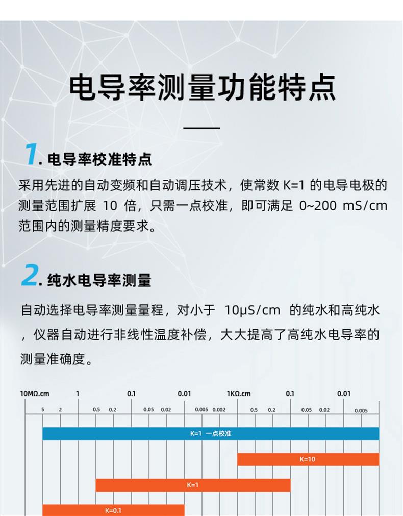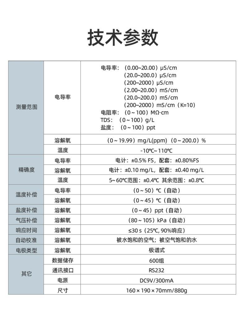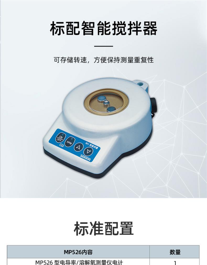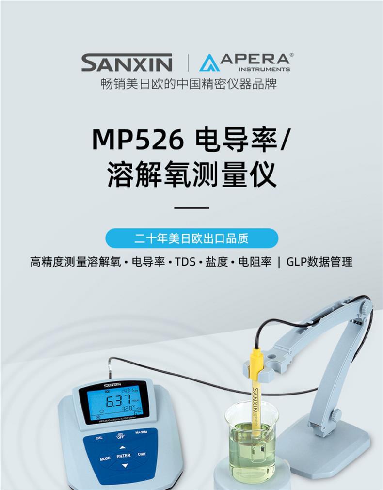 SANXIN MP526电导率/溶解氧测量仪是上海三信(Sanxin)推出的高性能水质分析设备,融合电导率、溶解氧、TDS、盐度、电阻率及温度多参数测量于一体。产品基于三信30年电化学研发经验,畅销美日欧市场,符合ISO 9001:2015质量体系认证。 该仪器采用先进的自动变频与调压技术,配合K=1电导电极,实现0~200 mS/cm宽范围高精度测量,并针对纯水和高纯水提供非线性温度补偿,显著提升测量准确性。溶解氧模块搭载专利三合一极谱式电极(专利号:ZL201320624287.6),集成温度与盐度传感器,极化时间仅需5分钟,支持自动温度、盐度和气压补偿,确保测量结果稳定可靠。 MP526具备600组GLP数据存储功能,支持手动或定时保存,并通过RS232接口实现数据输出与电脑连接。标配901型智能搅拌器,可记忆转速,提升测量重复性。仪器整机达到IP54防尘防溅等级,硅胶保护帽有效防护电极接口,适应复杂实验环境。 标准配置包括MP526主机、2401-M电导电极、DO500溶解氧电极、智能搅拌器、校准溶液、隔膜帽、电源适配器等全套配件。享受2年仪器保修、6个月电极保修服务,支持开具13%增值税专用发票。关注三信官方公众号,即可获取在线技术支持。 选择SANXIN,选择中国精密仪器的匠心品质。