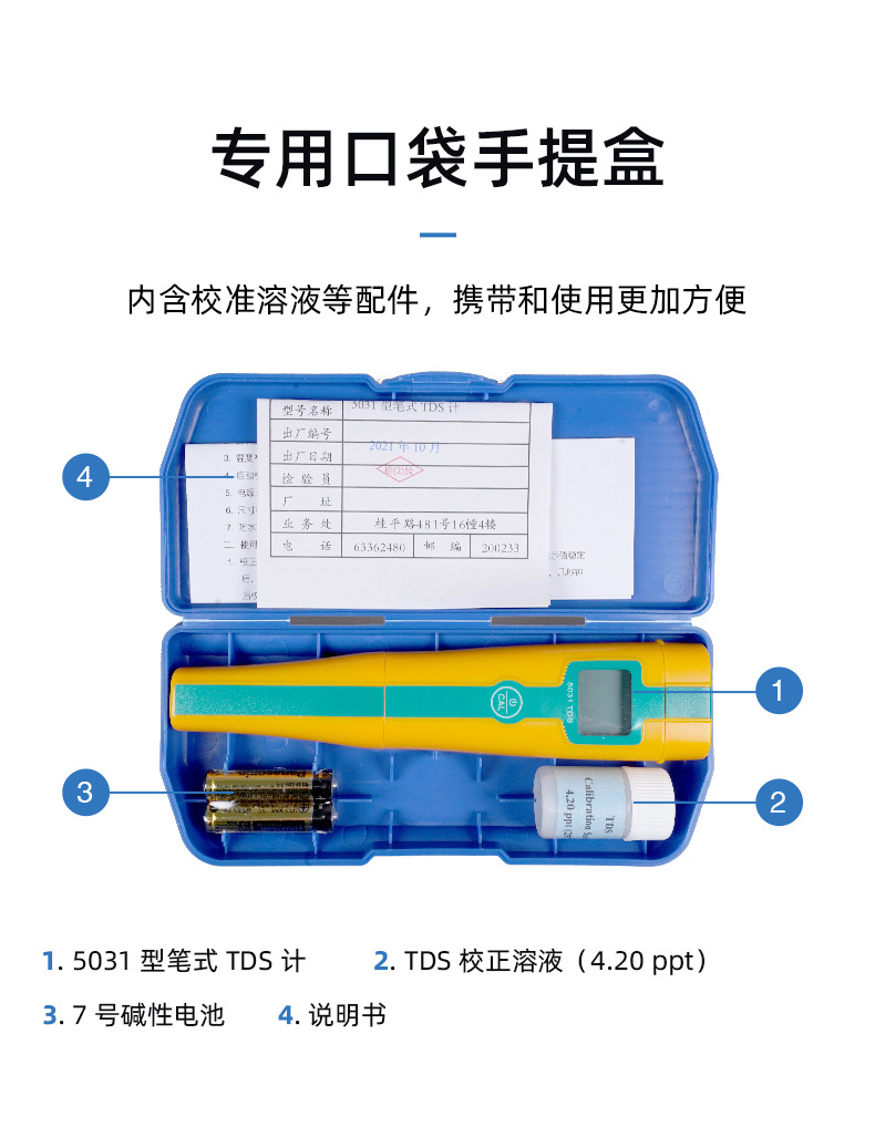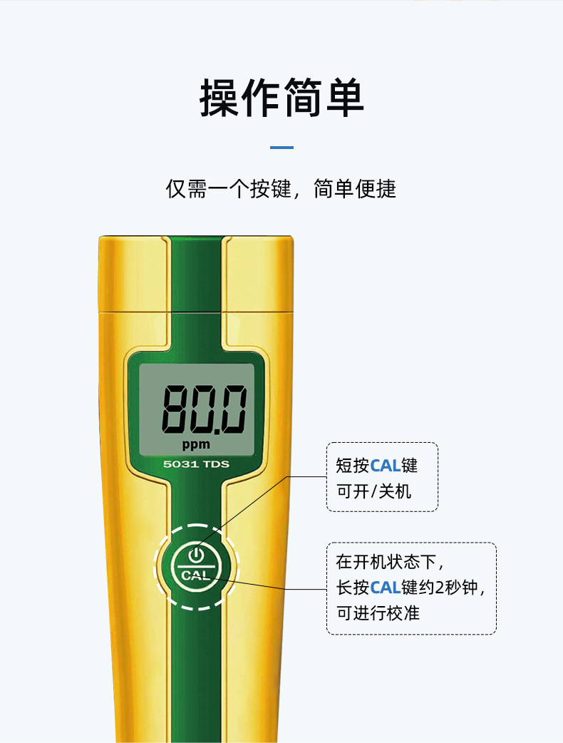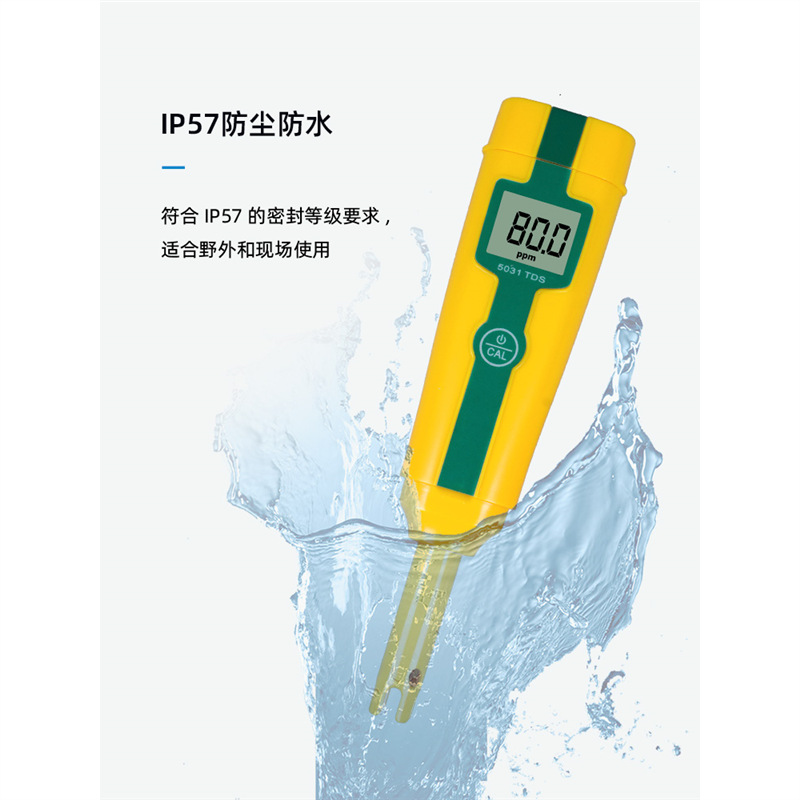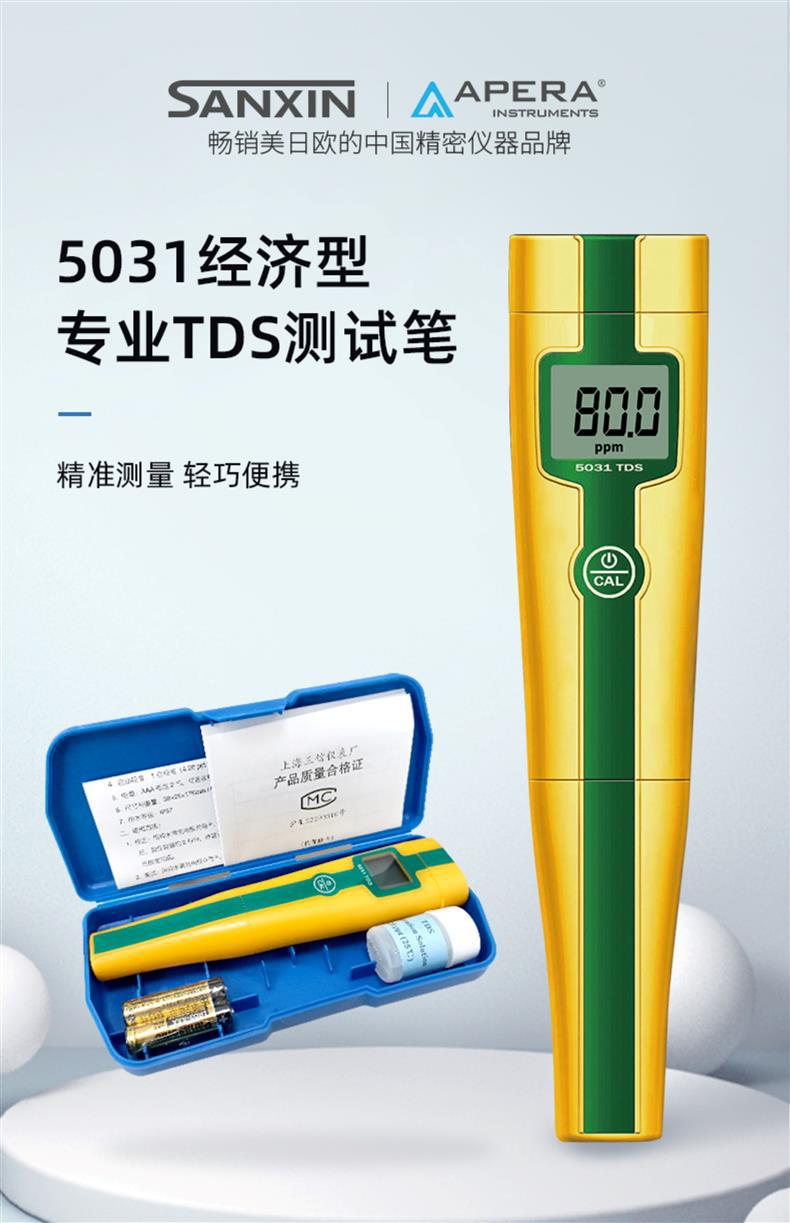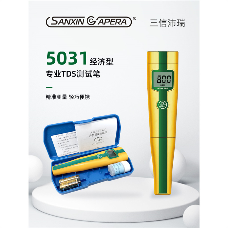 SANXIN APERA 5031经济型TDS测试笔是一款专为专业水质测量设计的高性价比便携仪器。采用坚固型铂黑电极,具备1点自动校准和0~50℃自动温度补偿功能,测量范围覆盖0~49.9ppm、50~499ppm及0.50~5.00ppt,精度达±2%FS。设备仅需单键操作,支持短按开关机与长按校准,使用便捷。整机尺寸为176×39×25mm,重量仅87g,轻巧易携,符合IP57防尘防水标准,适合实验室、现场监测、教育科研、水产养殖、游泳池管理等多种应用场景。标配包括TDS校正液、电池、说明书及专用手提盒。产品由上海三信仪表厂原厂生产,通过ISO 9001:2015质量体系认证,全球畅销美日欧等50多个国家。享受2年质保,支持开具13%增值税发票,满2000元赠定制礼品,是高可靠性与实用性的理想选择。