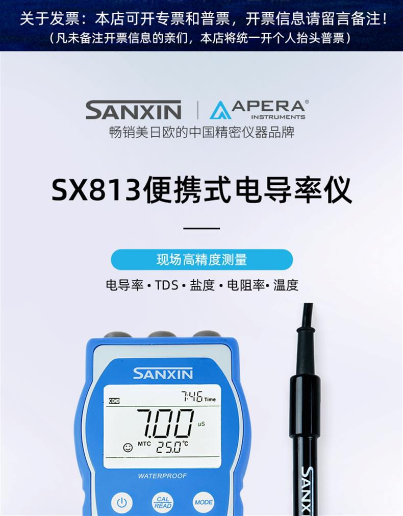 〉 上海三信便携式电导率仪测试仪SX813 TDS盐度计电阻率测量仪 专票