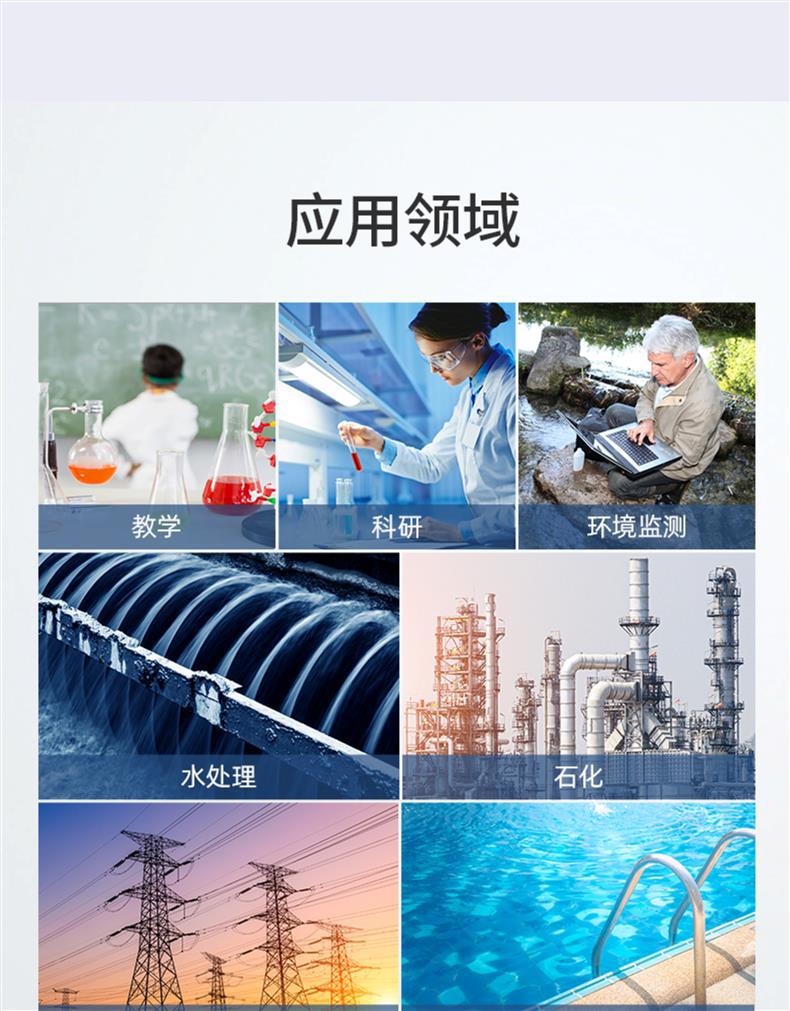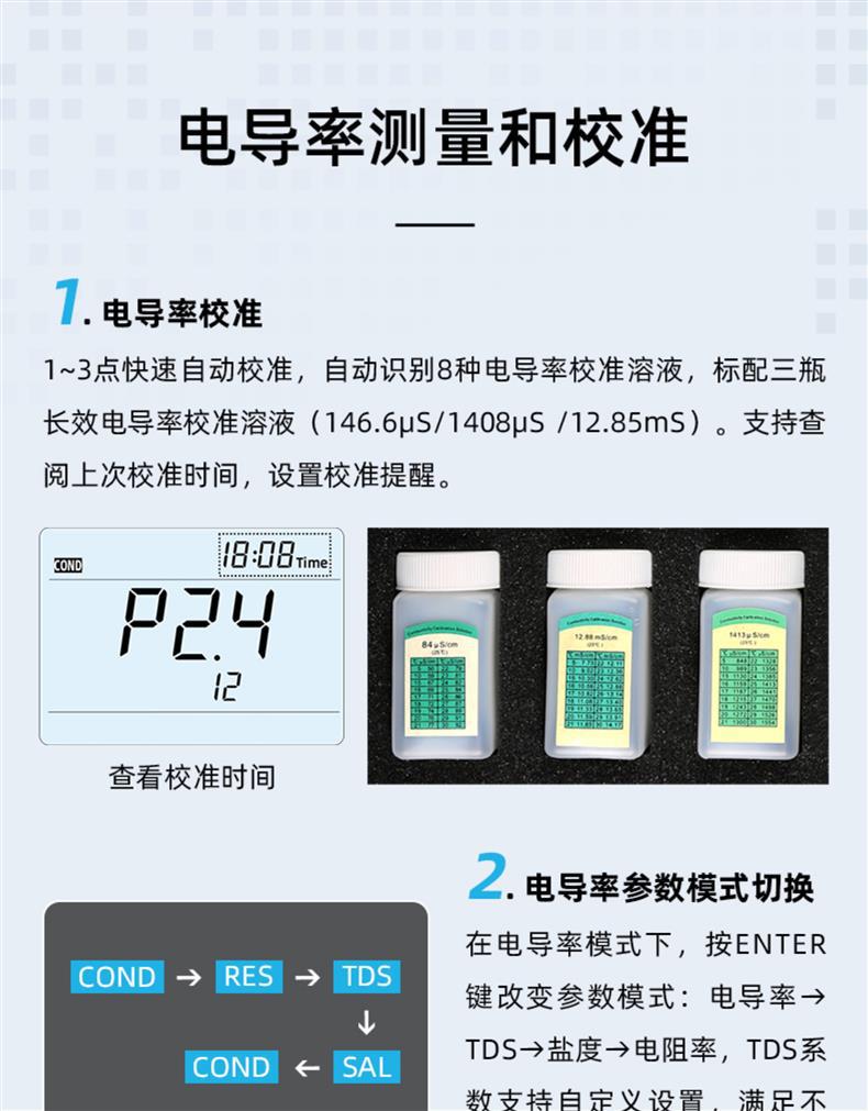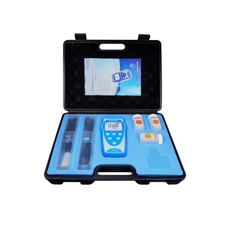 SANXIN SX813便携式电导率仪是一款专为现场高精度测量设计的多功能水质分析仪器,广泛应用于科研、环境监测、水处理、电力及石化等行业。仪器可测量电导率、TDS、盐度、电阻率和温度,配备坚固型铂黑电极(型号2301T-Q,K=1),具有极化小、量程宽、精度高、耐腐蚀、可清洗等优点,特别适合低电导率样品如纯水、蒸馏水的精确测量。 SX813采用16位TI智能芯片,具备超低功耗和先进的数字滤波技术,提升响应速度与测量准确性。支持1~3点自动校准,自动识别8种标准溶液,标配三瓶长效校准液(146.6μS、1408μS、12.85mS),并可查看上次校准时间,设置校准提醒。具备自动温度补偿功能(0~50℃),对高纯水自动进行非线性温度补偿,显著提高测量精度。 仪器内置500组GLP数据存储,记录编号、时间、日期、测量值及温度,支持USB数据输出与PC-Link通讯软件连接,便于数据管理与分析。IP57级防水防尘设计,搭配硅胶保护套和可折叠支架,适应各种恶劣使用环境。电源支持3节AA电池或USB 5V供电,方便户外长时间作业。 装箱包含:SX813主机、2301T-Q电导电极、三瓶校准液、USB电缆、通讯软件光盘、手提箱及说明书。整机享受2年保修,电极6个月保修。上海三信专注电化学分析30年,产品通过ISO 9001:2015、CE、RoHS认证,畅销美国、日本、欧洲等50多个国家,是中国精密仪器走向世界的代表品牌。