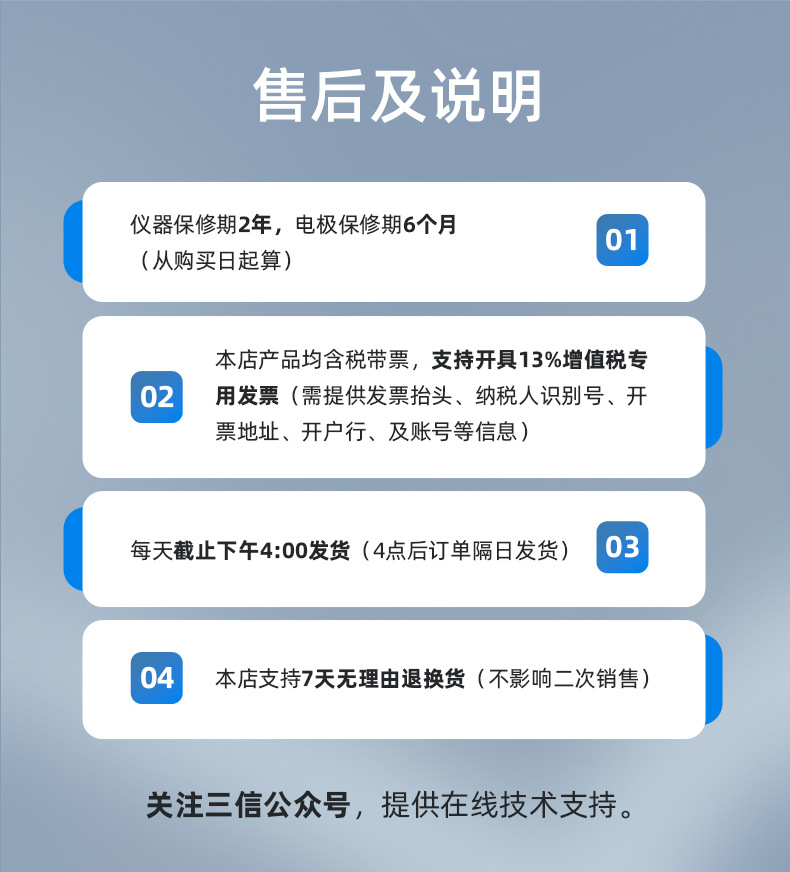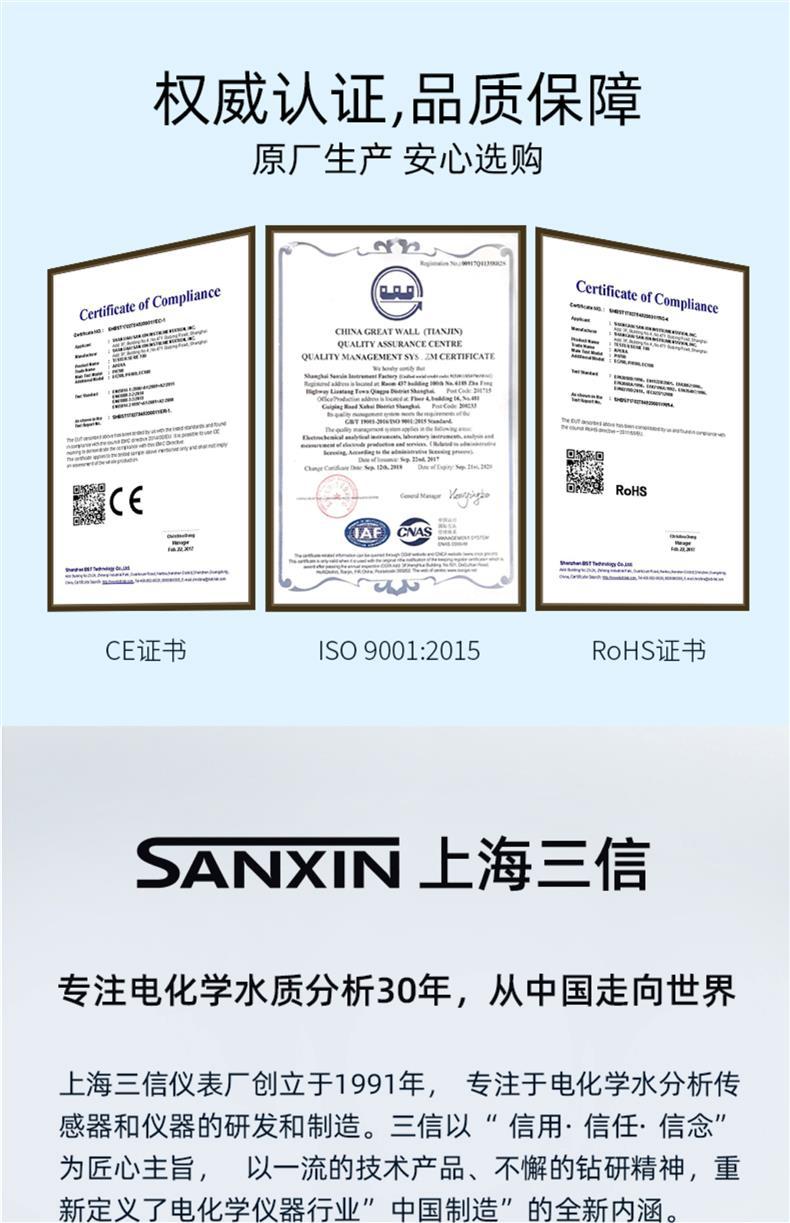 SANXIN(上海三信)MP500系列台式电导率仪是专为实验室和工业环境设计的高精度水质分析仪器,具备电导率、电阻率、TDS、盐度和温度多参数测量功能。该系列包含MP513、MP515-01、MP515-02和MP515-03四种型号,满足从常规水样到高纯水、高浓度溶液的广泛测量需求。 产品标配坚固型铂黑电导电极,采用先进镀层技术,减少极化效应,提升测量稳定性和耐用性,支持软毛刷清洗。内置温度探头实现自动温度补偿,确保测量准确性。MP515系列支持600组GLP数据存储,并配备RS232接口,便于数据导出与电脑连接。 MP515-02专为高纯水设计,配备DJS-0.1-M电极;MP515-03适用于高浓度电解质、海水等场景,量程高达2000mS/cm。仪器符合IP54防尘防溅标准,操作安全可靠。 三信拥有30年电化学分析经验,产品通过CE、ISO9001:2015、RoHS等多项国际认证,远销美国、日本、欧洲等50多个国家。品牌旗下APERA(沛瑞)在美国、德国、日本设有分公司,提供全球技术支持。 购买即享2年仪器保修、6个月电极保修,支持开具13%增值税专用发票。订单满2000元赠送定制皮革笔记本+水性笔,多件购买享阶梯折扣,性价比高。