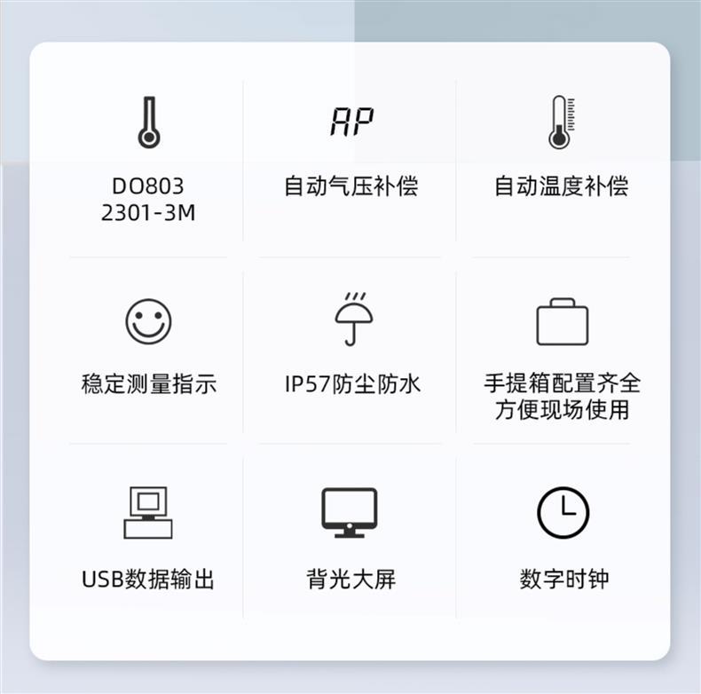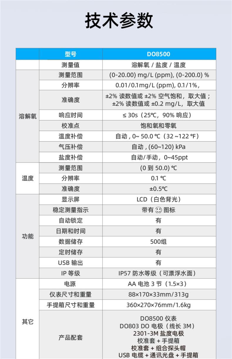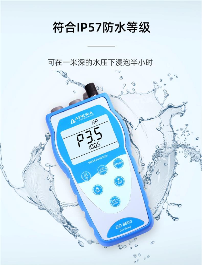 SANXIN CAPERA(上海三信沛瑞仪器科技有限公司)D08500光学溶解氧仪是一款专业级便携式水质检测设备,采用先进的荧光法光学技术,搭载DO803光学溶解氧电极,测量过程中不消耗氧气,确保读数稳定、响应迅速(≤15秒),无需频繁校准,使用寿命长达8000小时。仪器具备自动温度补偿(ATC)、自动气压补偿和自动/手动盐度补偿功能,测量范围为(0-20.00)mg/L或(0-200.0)%,分辨率高达0.01mg/L,准确度为±2%读数或±0.2mg/L(取大值)。内置数字时钟、500组数据存储及定时记录功能,支持USB数据输出与PC通讯软件对接。LCD背光大屏清晰显示,操作简便,符合IP57防水等级,可在1米水深下浸泡30分钟,适合现场使用。标配手提箱、盐度电极(2301T-F-3M)、校准套件等完整配件,广泛应用于环境监测、教育科研、饮用水质管理、水处理、水产养殖、游泳池与温泉等领域。产品通过ISO 9001:2015、CE、RoHS认证,享受全国联保2年服务,是高可靠性与高性能的国产电化学水质分析代表之作。