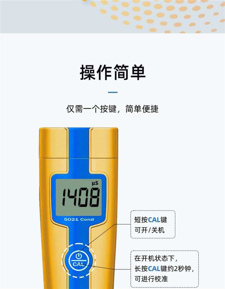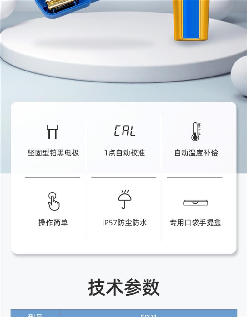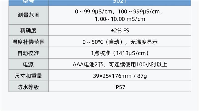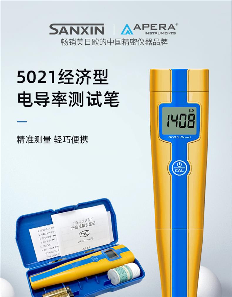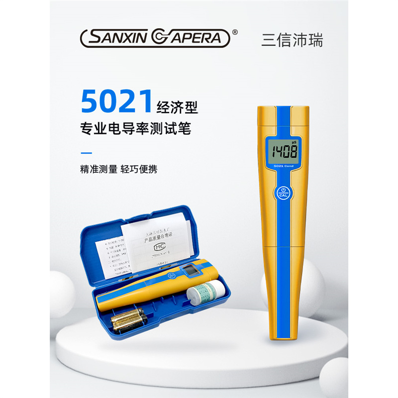 SANXIN 5021经济型电导率测试笔是由上海三信仪表厂(SANXIN)推出的高性价比便携式电导率测量仪器,品牌国际型号为APERA INSTRUMENTS,畅销美日欧市场。该设备配备坚固型铂黑电极,支持1点自动校准和0~50℃自动温度补偿,测量范围覆盖0~10.00 mS/cm,精度达±2%FS,适用于教育科研、环境监测、饮品质量、水处理、水产养殖、水培及游泳池等多种应用场景。 产品特点包括:仅需一键操作,短按开机/关机,长按进入校准;智能芯片设计,具备自动关机、低电压提示等功能;IP57级防尘防水,适合野外与现场使用;配备专用口袋手提盒,内含校准液、电池及说明书,携带方便。 本产品由三信原厂生产,拥有ISO 9001:2015质量管理体系认证,整机享受2年保修服务。支持开具13%增值税专用发票或普通发票,订单满2000元赠送定制皮革笔记本+水性笔(价值50元)。一件享8.5折,两件8.2折,五件以上8折,是实验室与现场检测的理想选择。