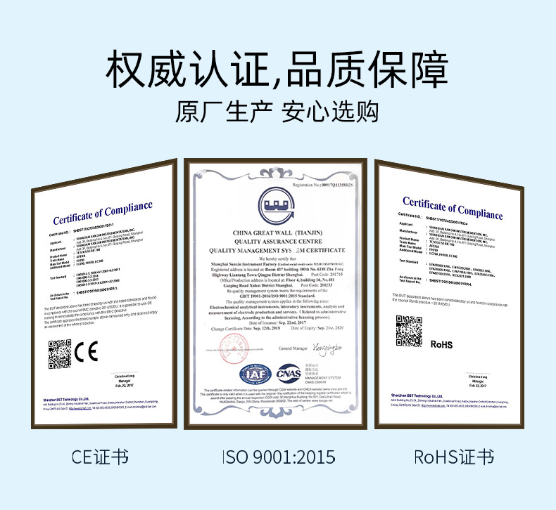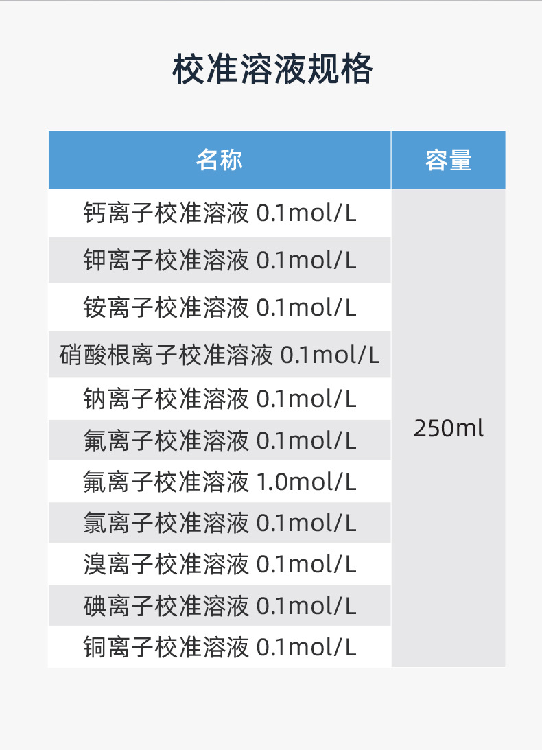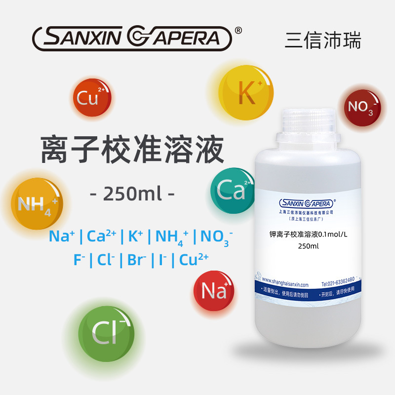 上海三信沛瑞仪器科技有限公司(原上海三信仪表厂)专业研发生产电化学水质分析产品30年,旗下品牌SANXIN CAPERA提供高精度离子校准溶液,包括钠(Na⁺)、铜(Cu²⁺)、钙(Ca²⁺)、钾(K⁺)、铵(NH₄⁺)、硝酸根(NO₃⁻)、氟(F⁻)、氯(Cl⁻)、溴(Br⁻)、碘(I⁻)等多种0.1mol/L标准溶液,规格为250ml。本系列产品符合中国国家标准,量值可追溯,专为离子选择性电极校准设计。由于低浓度溶液易受污染,建议使用时适量倒出、避免倒回,并在开封后尽快使用。公司通过ISO 9001:2015质量管理体系认证,产品出口全球50多个国家,品质可靠,广泛应用于实验室、环境监测与工业过程控制领域。